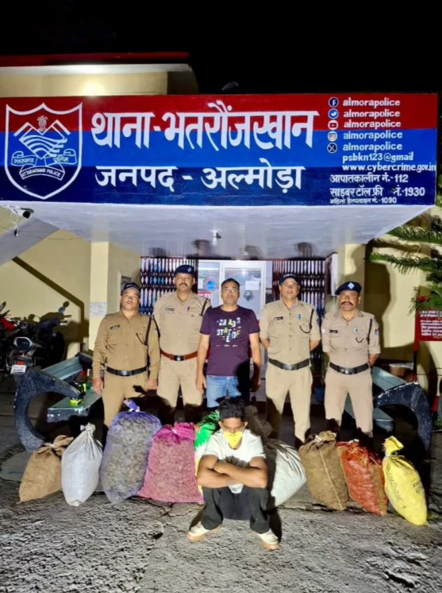 अल्मोड़ा भतरौजखान पुलिस टीम ने मोहान चैक पोस्ट के पास एक अर्टिगा कार से गांजे का बड़ा जखीरा बरामद किया है। कार चालक अंधेरे का फायदा उठाकर भाग गया, जबकि उसके साथी को गिरफ्तार कर लिया गया है। कार से से 09 कट्टों में 84.075 किलोग्राम अवैध गांजा बरामद हुआ है। गांजे की कीमत 21,01,875 रुपये आंकी गई है।