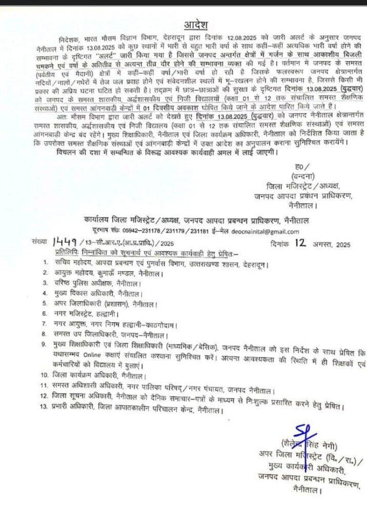 नैनीताल। लगातार हो रही भारी बारिश और 13 अगस्त को भी अत्यंत भारी वर्षा की संभावना को देखते हुए नैनीताल जिले में बुधवार को कक्षा 1 से 12 तक के सभी शासकीय, अशासकीय और निजी विद्यालयों के साथ-साथ सभी आंगनबाड़ी केंद्रों में एक दिवसीय अवकाश घोषित कर दिया गया है। जिलाधिकारी वंदना ने बताया कि भारत मौसम विज्ञान विभाग ने राज्य के विभिन्न क्षेत्रों, विशेषकर नैनीताल जिले के लिए “रेड अलर्ट” जारी किया है।