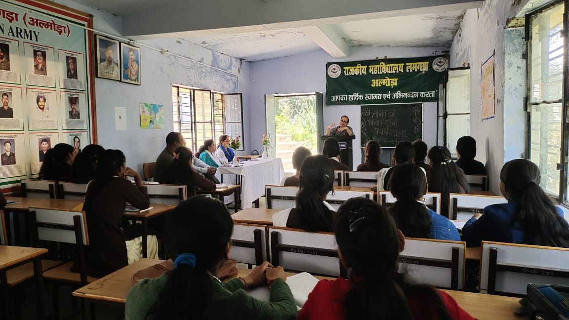 तत्पश्चात कार्यक्रम के संयोजक हेमन्त कुमार बिनवाल द्वारा तनाव प्रबंधन पर व्याख्यान दिया, तनाव (Stress) आज की भागदौड़ भरी जिंदगी का एक सामान्य हिस्सा बन गया है, लेकिन अगर इसका सही तरीके से प्रबंधन न किया जाए तो यह मानसिक और शारीरिक स्वास्थ्य पर नकारात्मक प्रभाव डाल सकता है। तनाव के कारण अलग-अलग हो सकते हैं, और ये हर व्यक्ति के जीवन में भिन्न होते हैं:व्यक्तिगत जीवन की समस्याएँ: परिवारिक समस्याएँ, रिश्तों में तनाव, अकेलापन, बच्चों की चिंता, पेशेवर जीवन की समस्याएँ: नौकरी का दबाव, समय सीमा, सहकर्मियों के साथ मतभेद, स्वास्थ्य संबंधी चिंताएँ: शारीरिक रोग, मानसिक स्वास्थ्य समस्याएँ,जीवनशैली संबंधी कारण: खराब खानपान, पर्याप्त नींद न मिलना, शारीरिक गतिविधि की कमी। तत्पश्चात तनाव के लक्षण पर बात की गई, बताया गया कि  तनाव के लक्षण मानसिक, शारीरिक और भावनात्मक हो सकते हैं: मानसिक लक्षण: चिंता, चिड़चिड़ापन, निर्णय लेने में कठिनाई, ध्यान केंद्रित करने में कठिनाई, शारीरिक लक्षण: सिरदर्द, थकान, नींद न आना, हृदय गति का बढ़ना, भावनात्मक लक्षण: अवसाद, निराशा, डर, असहाय महसूस करना। वक्ता द्वारा तनाव प्रबंधन के विभिन्न तरीकों पर भी चर्चा की गयी|  तनाव प्रबंधन के तरीके कई हैं, जैसे ध्यान और योग का अभ्यास करना, नियमित शारीरिक गतिविधियाँ करना, समय का सही प्रबंधन करना, सकारात्मक सोच विकसित करना, सामाजिक समर्थन प्राप्त करना, पर्याप्त नींद और आराम लेना, स्वस्थ आहार का पालन करना, और गहरी सांस लेने की तकनीकों का उपयोग करना। छात्र छात्राओं को गहरी सांस लेने की तकनीक (Deep Breathing Exercises) के माध्यम से  तनाव मुक्त अभ्यास करवाया गया | बताया गया कि लगातार स्मार्टफोन और सोशल मीडिया का उपयोग भी तनाव का कारण हो सकता है। स्क्रीन टाइम को कम करना और सोशल मीडिया का जिम्मेदारीपूर्वक उपयोग करना मानसिक शांति को बनाए रखने में सहायक हो सकता है। एक डिजिटल डिटॉक्स लेना, जहां आप एक दिन या कुछ समय के लिए इलेक्ट्रॉनिक डिवाइस से दूर रहते हैं, भी तनाव कम करने में सहायक होता है। साथ ही हंसना तनाव को कम करने का एक प्राकृतिक तरीका है। जो प्राकृतिक दर्द निवारक और तनाव को कम करने वाला होता है। इसलिए, रोज़ाना कुछ ऐसा करना जो आपको हंसाए, मानसिक स्वास्थ्य के लिए महत्वपूर्ण है। हास्य की भावना विकसित करने से भी तनाव को हल्का किया जा सकता है।