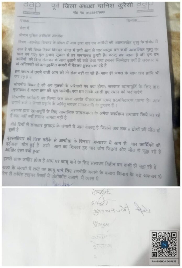 अल्मोड़ा से प्राप्त सूचना के अनुसार विगत दिवस विनसर जंगल में लगी आग से चार मासूम वन कर्मी आकस्मित मृत्यु का ग्रास बन गए, इस दुःखद सूचना से हर जनमानस दुःखी है, परन्तु प्रश्न आता है की इन वन कर्मियों को बिना संसाधन के आग बुझाने को क्यों भेजा गया इसका जिम्मेदार क्यों है सरकार या वो अधिकारी जो वतानुकूलित कमरों में बैठकर हुक्म चला रहे है ल