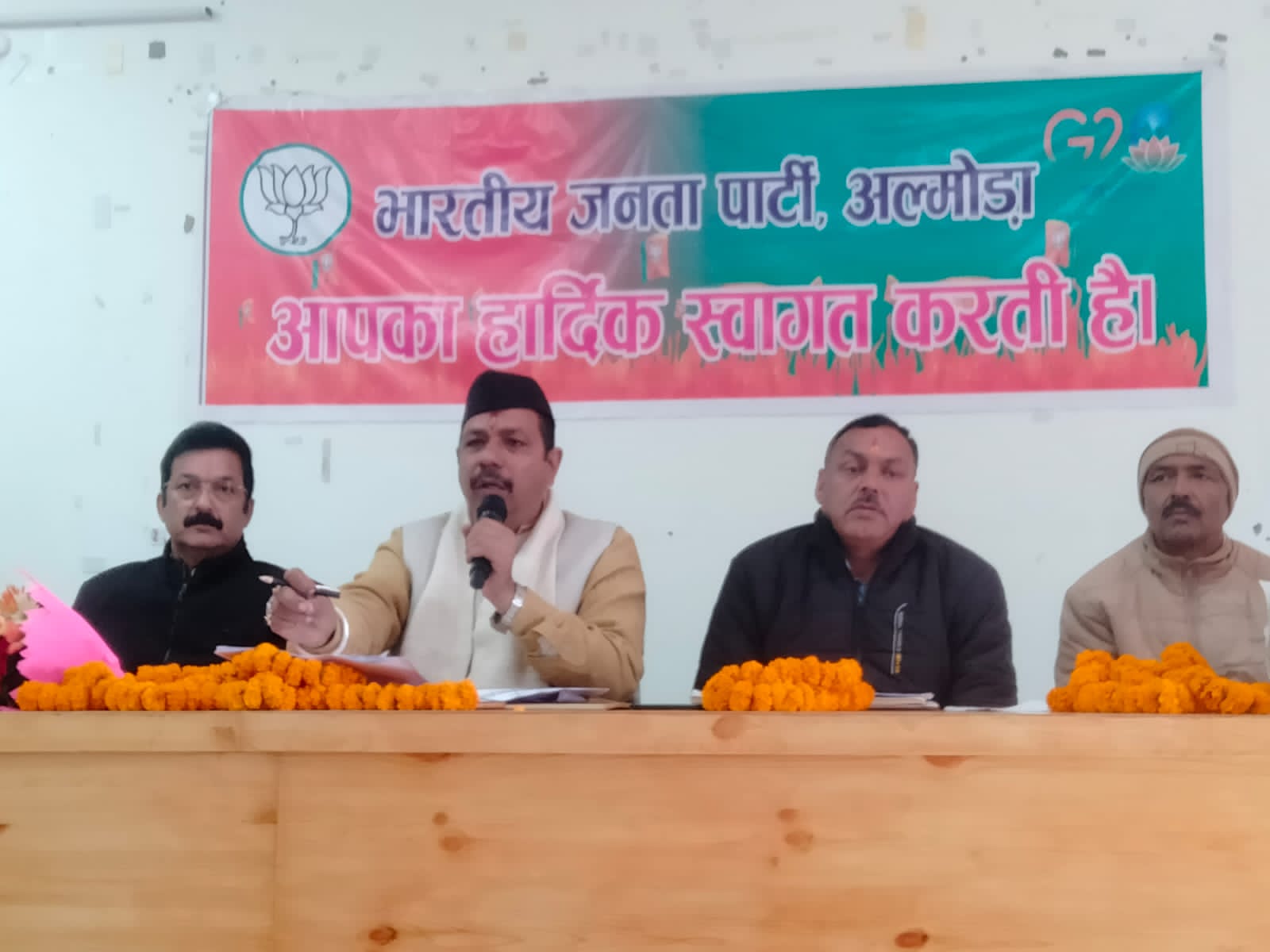 अल्मोड़ा आज दिनांक 11/12/2024 को प्रातः 11:00 बजे भारतीय जनता पार्टी पाताल देवी कार्यालय में अल्मोड़ा जिला के प्रभारी,नगर निगम चुनाव अल्मोड़ा प्रभारी माननीय प्रदीप बिष्ट जी नगर निगम चुनाव संबंधित बैठक ली ,जिसमें नगर निगम के मेयर पद के दावेदार ,पार्षद पद के दावेदार ,, पूर्व विधायक , पूर्व राज्य मंत्री, प्रदेश पदाधिकारी, जिला पदाधिकारी नगर मंडल के समस्त पदाधिकारी, समस्त मोर्चा के अध्यक्ष महामंत्री ,शक्ति केंद्र के संयोजक, एवं बूथों के अध्यक्ष एवं भारतीय जनता पार्टी के कार्यकर्ता, पदाधिकारि उपस्थित रहे ,जिला अध्यक्ष रमेश बहूगूणा जी की अध्यक्षता में बैठक आयोजित हुई, कार्यक्रम का शुभारंभ में निकाय चुनाव व अल्मोड़ा प्रभारी प्रदीप बिष्ट जी का पुष्प गुच्छ भेंट कर स्वागत अभिनन्दन किया गया,दीप प्रज्ज्वलित कर राष्ट्रीगान के साथ कार्यक्रम की शुरुआत की गई, मंच पर आसीन प्रभारी प्रदीप बिष्ट, पुर्व विधायक कैलाश शर्मा जी,जिला अध्यक्ष रमेश बहूगूणा, महामंत्री धर्मेन्द्र बिष्ट, ललित दोसाद,नगर अध्यक्ष अमित शाह मोनू, , निकाय चुनाव प्रकोष्ठ के दर्शन रावत,, पुर्व जिला अध्यक्ष रवि रोतेला, अरविंद बिष्ट उपस्थित थे, कार्यक्रम को संबोधित करते हुए जिला अध्यक्ष रमेश बहूगूणा जी ने सभी कार्यकर्ताओं व पदाधिकारियों को संबोधित करते हुए निकाय चुनाव में अपनी अपनी तैयारियों में जुटने का आह्वान किया, सभी से तैयारीयो को लेकर अपडेट लिए, तथा सभी पदाधिकारियों,व कार्यकर्ताओं को समर्पित भाव से भारतीय जनता पार्टी के प्रत्याशीयों की पार्षदों को चुनकर लाने और भारतीय जनता पार्टी का मैयर बनाने का संकल्प लेने को कहा, सभी को चुनाव की हार्दिक शुभकामनाएं दी, पुर्व विधायक कैलाश शर्मा जी ने भी सभी को संबोधित करते हुए सभी प्रत्याशियों को कमर कस कर चुनाव में तैयारियां करने को कहा, सभी प्रत्याशियों को तन मन से जुटने का आह्वान किया,प्रतयेक प्रत्याशियों को अभी से अपने अपने वार्डों में जोर शोर से प्रचार में जुटेने को कहा, पुर्व विधायक कैलाश शर्मा जी ने सभी प्रत्याशियों को चुनाव में अपना सहयोग तन मन धन से देने का भरोसा दिलाया , उन्होंने मेयर पद व पार्षदों की महिला उम्मीदवार से भी तन मन से अभी से जुटने को कहा सभी महिलाएं प्रत्याशियों को भी अपने तरफ से पुरा सहयोग देने का भरोसा दिलाया,, प्रभारी प्रदीप बिष्ट ने सभी उम्मीदवारों की तैयारियों को लेकर अपडेट लिए तथा सभी को तन मन से जुटने का आह्वान किया, प्रभारी ने सभी कार्यकर्ताओं को चुनाव में जाने को लेकर क ई सुझाव दिए, सभी को आज से अभी से लग जाने व सभी को साथ लेकर चलने का निवेदन किया, भारतीय जनता पार्टी को 40 से 40 रिकार्ड तोड व नगर निगम अल्मोड़ा का मेयर भी भाजपा का रिकॉर्ड तोड मतों से विजई बनाकर ल