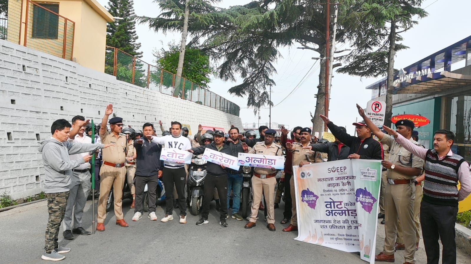 जिला अधिकारी /जिला निर्वाचन अधिकारी अल्मोड़ा विनीत तोमर व एसएसपी अल्मोड़ा देवेन्द्र पींचा के निर्देशन में सीओ अल्मोड़ा विमल प्रसाद द्वारा सर्वप्रथम उपस्थित समस्त अधिकारी/कर्मचारीगणों व गणमान्य व्यक्तियों को मतदाता जागरुकता शपथ दिलाई गयी। इसके उपरान्त सीओ अल्मोड़ा द्वारा रघुनाथ सिटी माँल से मतदाता जागरुकता बाईक रैली को हरी झंडी दिखाकर रवाना किया गया । रैली मालरोड चौघानपाटा, केमू स्टेशन,टैक्सी स्टैण्ड, शिखर तिराहा, लक्ष्मेश्वर, पाण्डेखोला बाई पास से होते हुए लोअर माल रोड, बेस तिनाराधार, होटल मैनेजमेंट करबला होते हुए वापस रघुनाथ सिटी माँल पर सम्पन्न हुई ।