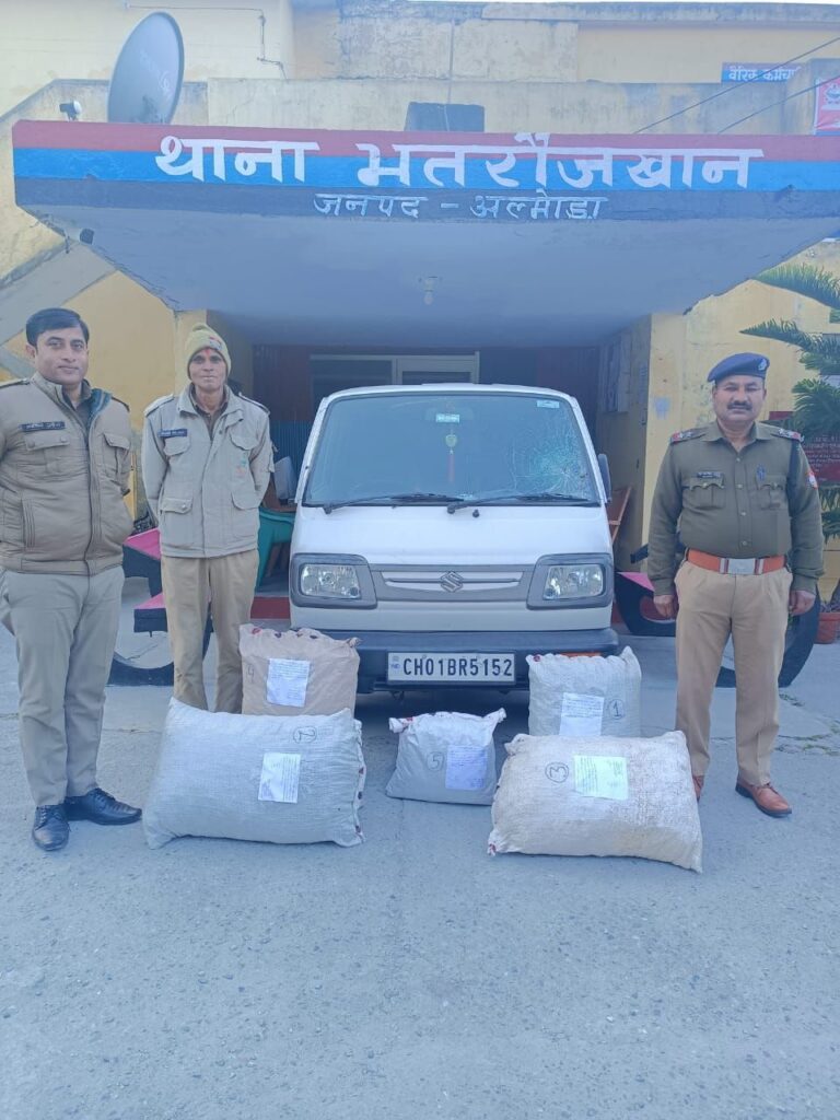 भतरौजखान पुलिस व एसओजी/एएनटीएफ टीम की संयुक्त कार्यवाही, मारुति वैन से लगभग साढे सात लाख कीमत का गांजा किया बरामद देवेन्द्र पींचा, वरिष्ठ पुलिस अधीक्षक अल्मोड़ा द्वारा ड्रग्स फ्री देवभूमि मिशन 2025 को सफल बनाने के उद्देश्य से जनपद के सीओ, थाना/चौकी प्रभारियों एवं एसओजी/एएनटीएफ टीम को नशे के विरुद्ध लगातार अभियान चलाकर मादक पदार्थों की तस्करी/बिक्री करने वाले नशा तस्करों के विरुद्ध कड़ी कार्यवाही करने के निर्देश दिये गये हैं। सीओ अल्मोड़ा/आँपरेशन विमल प्रसाद के पर्यवेक्षण में दिनांक- 16-17/01/2024 को थाना भतरौजखान पुलिस व एसओजी/एएनटीएफ टीम द्वारा संयुक्त चेकिंग के दौरान पुलिस सहायता केन्द्र मोहान पर एक मारुति वैन ( ओमिनी) नंबर- CH01BR-5152 को रोका गया तो चालक वाहन छोड़कर रात्रि में अंधेरे का फायदा उठाकर मौके से फरार हो गया है, वाहन की तलाशी लेने पर 05 कट्टों में कुल 49.548 किलोग्राम गांजा बरामद हुआ। गांजा परिवहन में प्रयुक्त वाहन मारुति वैन को सीज किया गया। उक्त बरामदगी के आधार पर थाना भतरौजखान में अज्ञात अभियुक्त के विरुद्ध एनडीपीएस अधिनियम के तहत एफआईआर पंजीकृत की गई है।अभियुक्त की तलाश/गिरफ्तारी हेतु प्रयास किये जा रहे है।