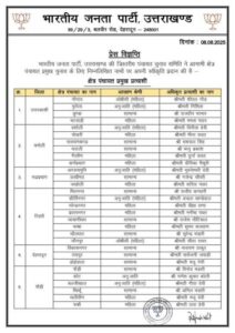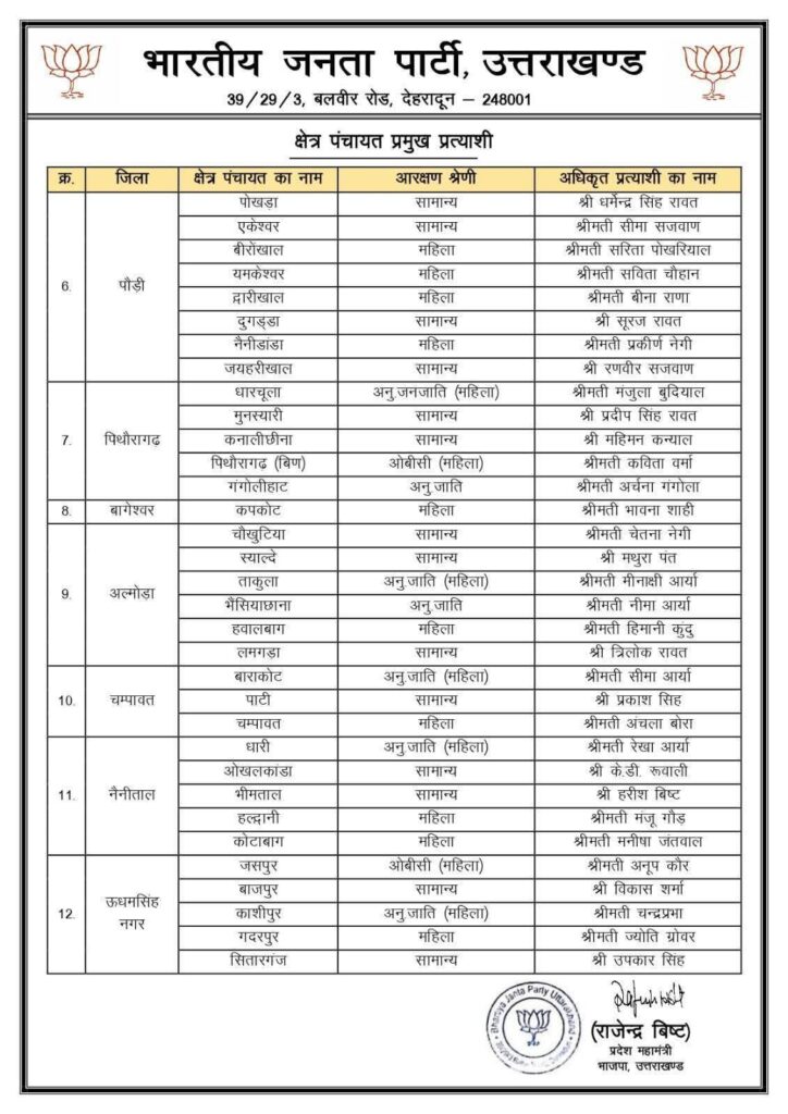 देहरादून। उत्तराखण्ड में चल रही त्रिस्तरीय पंचायत चुनाव प्रक्रिया के तहत भारतीय जनता पार्टी ने क्षेत्र पंचायत प्रमुख पद के लिए अपने अधिकृत प्रत्याशियों की घोषणा कर दी है। पार्टी की त्रिस्तरीय पंचायत चुनाव समिति की बैठक में सर्वसम्मति से प्रत्याशियों के नामों पर मुहर लगाई गई। भाजपा ने यह निर्णय संगठन के दिशा-निर्देशों व स्थानीय जनसमर्थन के आधार पर लिया है।