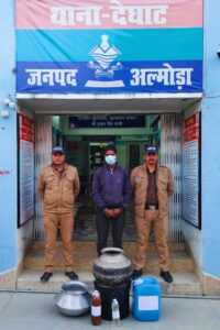 सीओ अल्मोड़ा विमल प्रसाद के पर्यवेक्षण व थानाध्यक्ष देघाट राहुल राठी के नेतृत्व में दिनांक 07/01/2024 को थाना देघाट पुलिस द्वारा दूरस्थ ग्रामीण क्षेत्र ग्राम फोटीकुआं में औचक चेंकिग के दौरान एक व्यक्ति को अवैध रूप से कच्ची शराब व शराब बनाने की भट्टी मय उपकरणों के साथ पकड़ा गया। इस दौरान मौके का फायदा उठाकर एक व्यक्ति फरार हो गया। देघाट पुलिस टीम ने अभियुक्त के कब्जे से 23 लीटर कच्ची शराब व शराब बनाने के उपकरण बरामद किये व कुल 28 टिन (लगभग 420 लीटर) कच्चा लहन बरामद होने पर मौके पर ही नष्ट किया गया। कच्ची शराब के साथ पकड़े गए अभियुक्त पूरन सिंह को गिरफ्तार कर उसके व फरार अभियुक्त पान सिंह पुत्र सोबन सिंह निवासी ग्राम फोटीकुआं देघाट अल्मोड़ा के विरुद्ध आबकारी अधिनियम के अन्तर्गत थाना देघाट में एफ0आई0आर0 पंजीकृत करते हुए आवश्यक कार्यवाही की गई ।