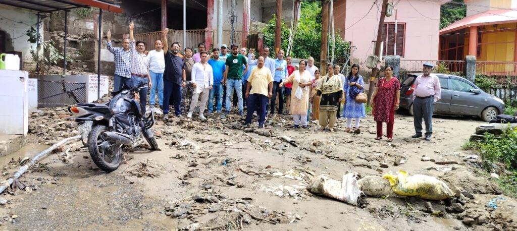 अल्मोड़ा-विगत सायं एक घन्टे की हुई तेज बारिश से रानीधारा क्षेत्र में लोगों के घरों में मलबा घुस गया।जिससे गुस्साए लोगों ने आज रानीधारा नौले के पास एकत्रित होकर सभाषद अमित साह मोनू के नेतृत्व में नगरपालिका और प्रशासन के खिलाफ जोरदार प्रदर्शन किया।इस अवसर पर स्थानीय लोगों ने नगरपालिका और प्रशासन के खिलाफ जमकर नारेबाजी की। सभाषद अमित साह मोनू ने कहा कि हर बारिश में रानीधारा क्षेत्र में लोगों के घरों में मलवा घुस रहा है लेकिन नगरपालिका और प्रशासन के द्वारा कोई भी कार्यवाही नहीं की जा रही है।