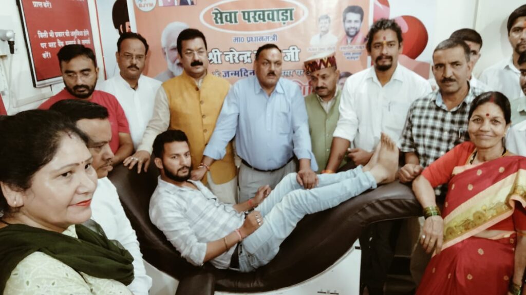 आज भारतीय जनता युवा मोर्चा अल्मोड़ा के जिला अध्यक्ष राजन चन्द्र जोशी के नेतृत्व में देश के यशस्वी प्रधानमंत्री श्री नरेन्द्र मोदी जी के जन्मदिन के अवसर पर चलने वाले सेवा सप्ताह पर जिला अस्पताल अल्मोड़ा में रक्तदान का आयोजन किया गया। जिसका उद्घाटन प्रदेश उपाध्यक्ष व पूर्व विधायक कैलाश शर्मा जी,जिला अध्यक्ष श्री रमेश बहुगुणा जी,मोर्चा अध्यक्ष राजन जोशी ने किया। जिलाध्यक्ष राजन जोशी ने कहा कि सेवा सप्ताह के अंतर्गत पूरे जिले में तीनों विधानसभाओं में अल्मोड़ा,जागेश्वर,सोमेश्वर में रक्तदान शिविर युवा मोर्चा द्वारा किए जा रहे हैं। रक्तदान शिविर में युवा बड़े उत्साह से प्रतिभाग कर रहे हैं। और युवाओं की लगभग 500 डोनरों की सूची तैयार की गई है जो कि रक्तकोष में रक्त की कमी होने पर रक्तदान करेंगे। कार्यक्रम में प्रदेश उपाध्यक्ष व पूर्व विधायक कैलाश शर्मा जी जिलाध्यक्ष रमेश बहुगुणा पूर्व जिला अध्यक्ष पूर्व राज्य मंत्री श्री गोविंद पिलखवाल जी रवि रौतेला, जिला उपाध्यक्ष कैलाश गूरुरानी बीना नयाल, मीना भैसोड़ा महामंत्री धर्मेन्द्र बिष्ट सह मिडिया प्रभारी जगत तिवारी महिला मोर्चा अध्यक्ष लीला बोरा, , नगर महा मंत्री मनोज जोशी सभासद , यूवा मोर्चा अध्यक्ष चन्दन बहुगुणा,अल्पसंख्यक अध्यक्ष राजा खान, मण्डल अध्यक्ष हवालबाग संजय बिष्ट जी, अजय वर्मा जी,vसौरभ वर्मा जी सभासद चम्पा पांडे नेहा उप्रेती ,मनीष बिष्ट जी,मनन साह , चन्दन आर्य व युवा मोर्चा जिला पदाधिकारी नगर अध्यक्ष,मण्डल अध्यक्ष ग्रामीण,मण्डल पदाधिकारी युवा कार्यकर्ता आदि मौजूद रहे।