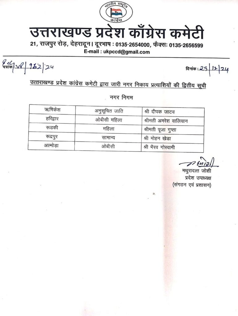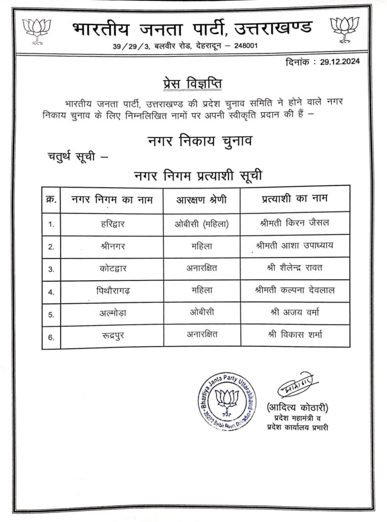 अल्मोड़ा। अल्मोड़ा में मेयर प्रत्यासी की घोषणा को लेकर बना सस्पेंस अब खत्म हो गया।भाजपा ने नगर निगम प्रत्याशियों की लिस्ट की जारी की है। है।