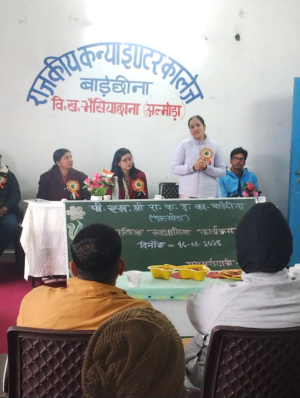 पीएम श्री राजकीय कन्या इंटर कॉलेज बाड़ेछीना में आज दिनांक 16 जनवरी 2024 को सामुदायिक सहभागिता कार्यक्रम का आयोजन किया। गया इस कार्यक्रम में मुख्य वक्ता के रूप में डाइट अल्मोड़ा से डॉ हेमलता धामी एवं डॉ दीपा जलाल को आमंत्रित किया गया था ।कार्यक्रम के शुभारंभ में प्रधानाचार्य प्रीति पंत के द्वारा सामुदायिक सहभागिता का विद्यालय विकास में योगदान पर प्रकाश डाला गया।