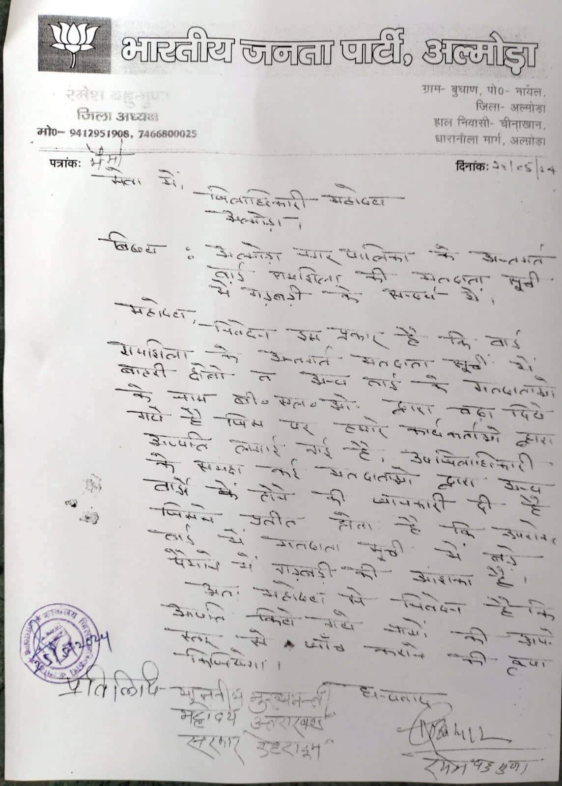 अल्मोड़ा नगर पालिका परिषद अल्मोड़ा की मतदाता सूची में नए नाम चढ़ाने व आपत्ति पर आज उप जिलाधिकारी कार्यालय में सुनवाई की गई इस अवसर पर भारतीय जनता पार्टी के एक शिष्ट मंडल ने उप जिलाधिकारी से मुलाकात की तथा नगर के विभिन्न वार्डों में आई हुई आपत्ति पर जांच कर कार्रवाई की मांग की गई इस अवसर पर अल्पसंख्यक मोर्चे के जिला महामंत्री तस्लीम अंसारी ने बताया कि रामशिला वार्ड में दो सौ से अधिक नाम पर उनके द्वारा आपत्ति की गई है इसमें कई मतदाताओं के नाम ऐसे पाए गए जो अन्य वार्डों में निवास करते हैं उनके नाम को रामशिला वार्ड में जोड़ दिया गया तथा कई मतदाताओं नाम ऐसे भी हैं जिनकी कोई जानकारी उपलब्ध नहीं है इस संबंध में उप जिलाधिकारी द्वारा साक्ष्य प्रस्तुत करने के लिए कहा गया इसके तत्पश्चात शिष्ट मंडल ने जिलाधिकारी से भेंट कर उन्हें इस घटनाक्रम से अवगत कराया जिस पर जिलाधिकारी ने जांच के आदेश दिए गए हैं इस अवसर पर जिला अध्यक्ष रमेश बहुगुणा ने कहा कि सभी मतदाताओं को वोट देने का समान अधिकार प्राप्त है लेकिन मतदाता सूची में किसी भी प्रकार की गड़बड़ी को बर्दाश्त नहीं किया जाएगा उन्होंने कहा कि इस संबंध में चुनाव आयोग व माननीय मुख्यमंत्री को भी अवगत कराया जाएगा ताकि नगर निकाय चुनाव निष्पक्ष तरीके से संपन्न कराये जा सके जिसके लिए भारतीय जनता पार्टी पूरी तरह तैयार है इस अवसर पर जिला अध्यक्ष रमेश बहुगुणा जिला महामंत्री धर्मेंद्र बिष्ट जिला उपाध्यक्ष कैलाश गुरुरानी नगर अध्यक्ष अमित साह मोनू नगर महामंत्री मनोज जोशी भाजपा अल्पसंख्यक मोर्चे के जिला महामंत्री तस्लीम अंसारी आदि उपस्थित थे ।