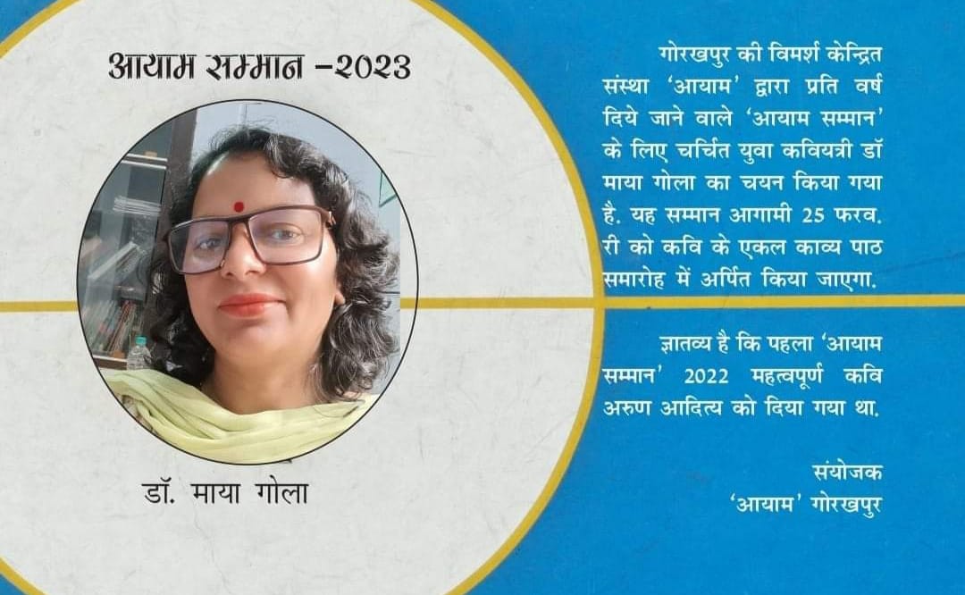 सोबन सिंह जीना विश्वविद्यालय अल्मोड़ा (उत्तराखण्ड) के हिंदी विभाग में कार्यरत असिस्टेंट प्रोफ़ेसर डॉक्टर माया गोला वर्मा का गोरखपुर,  उत्तर प्रदेश की विमर्श केंद्रित संस्था “आयाम” ने ‘ आयाम सम्मान -2023’ के लिए चयन किया है। यह सम्मान डॉक्टर माया गोला वर्मा को उनकी कविताओं के लिए दिया जा रहा है। अब तक उनके तीन कविता संग्रह प्रकाशित हो चुके हैं- चीनी नमक और नीम, कविता संग्रह, समय साक्ष्य प्रकाशन, देहरादून से ; चयनित कविताएं: माया गोला, न्यू वर्ल्ड पब्लिकेशन, नई दिल्ली से और उपाधियां लौटाती हूं ,न्यू वर्ल्ड पब्लिकेशन,नई दिल्ली से प्रकाशित हुआ है। गौरतलब है कि न्यू वर्ल्ड पब्लिकेशन,नई दिल्ली ने अपनी महत्त्वपूर्ण श्रृंखला “समकाल की आवाज़” के तहत 2023 में , उनकी कविताओं का चयन किया था। इस वर्ष उन्हें उनकी कविताओं के लिए आयाम सम्मान दिया जा रहा है। पिछले वर्ष यह सम्मान हिंदी के महत्त्वपूर्ण कवि अरुण आदित्य जी को दिया गया था।