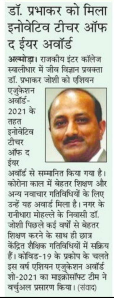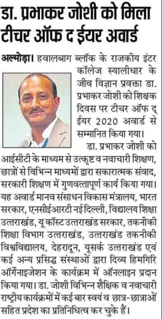 शिक्षा विभाग के काफी लोक्रप्रिय शिक्षक डॉ. प्रभाकर जोशी को विगत वर्ष राज्य में शैक्षिक प्रौद्योगिकी के क्षेत्र में उत्कृष्ट कार्य करने के लिए ‘उत्तराखंड विज्ञान शिक्षा प्रसार सम्मान’ से भी नवाजा जा चुका है। डॉ. जोशी राष्ट्रीय शिक्षक पुरस्कार 2020 में उत्तराखंड राज्य का प्रतिनिधित्व कर चुके हैं तथा नवाचारी शिक्षा में अभिनव प्रयोगों के लिए जाने जाते हैं।