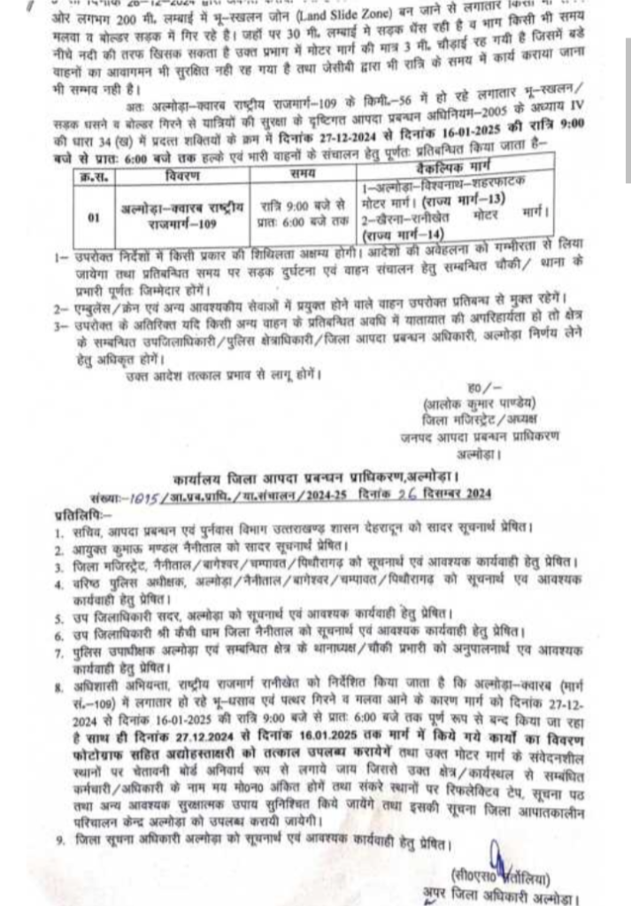 अल्मोडा। भवाली-अल्मोड़ा-हल्द्वानी राष्ट्रीय राजमार्ग पर क्वारब के पास सड़क की गंभीर स्थिति के चलते रात्रि के समय यातायात पर पूर्ण प्रतिबंध लगाया गया है।
