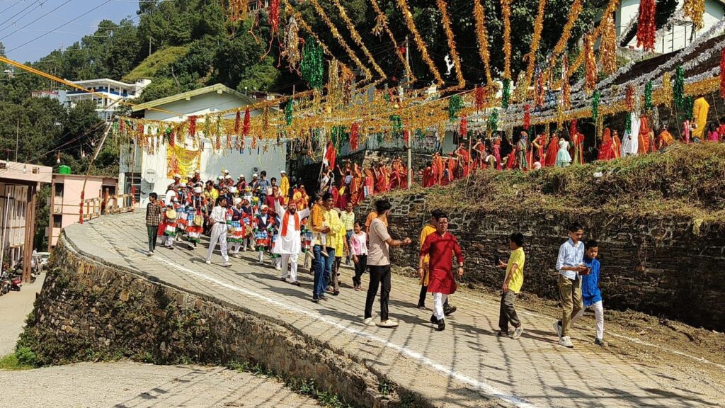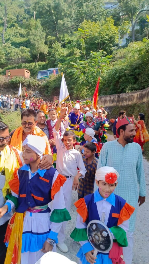 प्रातःकाल 10 बजे से खूँटकूनी भॆरव मन्दिर से श्री गणेश पूजन के साथ क्षेत्रवासियों एंव समिति सदस्यों के साथ बड़ी संख्या में महिलाओं द्वारा छोलिया नृतकों के साथ माँ के जयकारों के उदघोष के साथ शोभायात्रा निकाली।