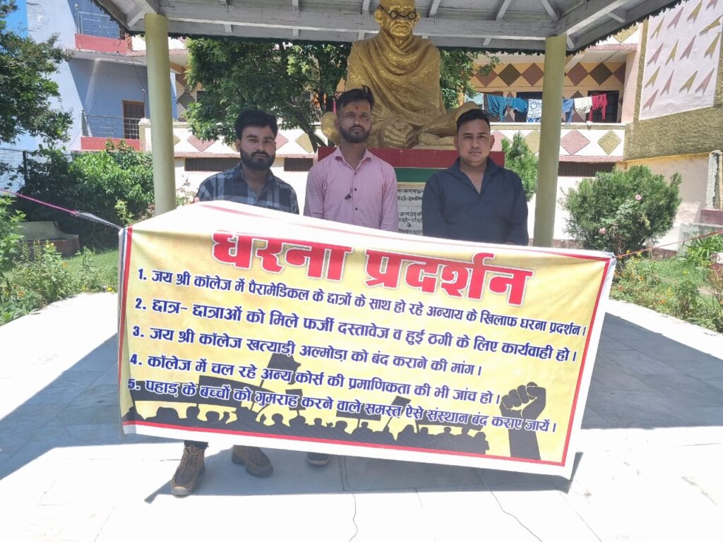अल्मोड़ा-नगर के खत्याड़ी स्थित एक संस्थान पर लाखों रुपए लेकर फर्जी डिग्री थमाने का आरोप लगाते हुए पैरामेडिकल की पढ़ाई पूरी कर चुके विद्यार्थियों ने प्रदर्शन किया। उन्होंने कहा कि फर्जी डिग्री देकर संस्थान ने उनके भविष्य के साथ खिलवाड़ किया है, इसके खिलाफ करवाई होनी चाहिए। उन्होंने फीस वापस न होने पर उग्र आंदोलन की चेतावनी दी है। संस्थान के पूर्व पैरामेडिकल विद्यार्थी चौघान पाटा के गांधी पार्क में एकत्र हुए और प्रदर्शन किया। उन्होंने बताया कि संस्थान में संचालित बैचलर ऑफ मेडिकल लेबोरेट्री टेक्नोलॉजी बैचलर ऑफ फिजियोथैरेपी कोर्स को उत्तराखंड पैराचिकित्सा परिषद से मान्यता नहीं मिली है। लेकिन संस्थान ने उन्हें अंधेरे में रखकर यह कोर्स कराते हुए फर्जी डिग्री थमा दी जो उनके उज्वल भविष्य के साथ खिलवाड़ कह सकते हैं।