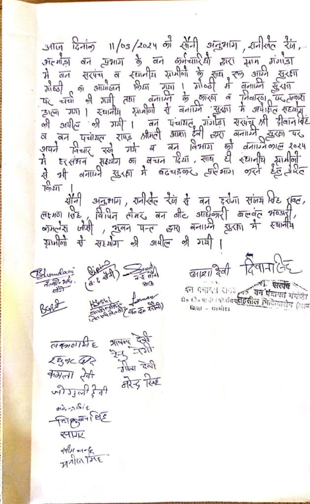 आज दिनांक 11.03.2024 को सौनी अनुभाग, रानीखेत रेंज, अल्मोड़ा वन प्रभाग के वन कर्मचारियों द्वारा ग्राम गंगोड़ा-रापड़ तहसील- भिकियासैंण में वन सरपंच व स्थानीय ग्रामीणों के साथ एक वन अग्नि सुरक्षा गोष्ठी का आयोजन किया। गोष्ठी में वनाग्नि सुरक्षा पर चर्चा की गयी तथा वनाग्नि के कारण व निवारण पर प्रकाश डाला गया। स्थानीय ग्रामवासियों से वनाग्नि सुरक्षा में अपेक्षित सहयोग की अपील की गयी। दीवान सिंह, सरपंच वन पंचायत गंगोड़ा व श्रीमती आशा देवी सरपंच वन पंचायत रापड़ द्वारा वनाग्नि सुरक्षा पर अपने विचार रखे गये व स्थानीय ग्रामवासियों से वन विभाग को वनाग्नि वर्ष 2024-25 में हरसंभव सहयोग का आह्वान किया गया।