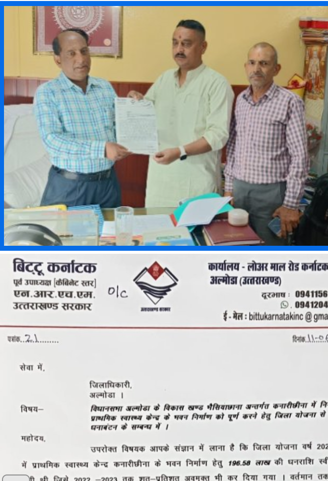 अल्मोड़ा-विधानसभा अल्मोडा के विकास खण्ड भैसियाछाना अन्तर्गत कनारीछीना में निर्माणाधीन प्राथमिक स्वास्थ्य केन्द्र के भवन निर्माण को पूर्ण करने हेतु जिला योजना से धनावंटन करने की मांग को लेकर पूर्व दर्जा मंत्री बिट्टू कर्नाटक ने जिलाधिकारी को पत्र प्रेषित किया , तथा मुख्य चिकित्सा अधिकारी अल्मोड़ा को ज्ञापन सौंप कर तत्काल कार्रवाई की मांग की। पत्र के माध्यम से श्री कर्नाटक ने कहा कि जिला योजना वर्ष 2021-2022 में प्राथमिक स्वास्थ्य केन्द्र कनारीछीना के भवन निर्माण हेतु 196.58 लाख की धनराशि स्वीकृत की गयी थी जिसे 2022- 2023 तक शत-प्रतिशत अवमुक्त भी कर दिया गया वर्तमान तक निर्माण कार्य मात्र 45 प्रतिशत ही पूर्ण हो पाया है। श्री कर्नाटक ने यह भी जोर देते हुए कहा कि इस क्षेत्र के अन्तर्गत चिकित्सा की पर्याप्त सुविधा न होने के कारण बीमार व्यक्तियों को अल्मोडा मेडिकल कालेज ले जाने के अतिरिक्त उनके पास कोई विकल्प नहीं है, उक्त निर्माणाधीन प्राथमिक स्वास्थ्य केन्द्र के में लाखों रूपये व्यय होने के बाद भी अभी तक भवन की छत नहीं पड़ पायी है। उन्होंने कहा कि प्राथमिक स्वास्थ्य केन्द्र कनारीछीना के भवन निर्माण हेतु पुनरीक्षित आंगणन रू. 398.86 लाख प्रेषित किया गया था जिसकी स्वीकृति वर्तमान तक अपेक्षित है। श्री कर्नाटक ने कहा कि इस प्राथमिक स्वास्थ्य केन्द्र के भवन को पूर्ण किये जाने हेतु पुनरीक्षित आंगणन के अनुसार धनराशि रू. 200 लाख की तत्काल आवश्यकता है, जिसके लिए उक्त प्राथमिक स्वास्थ्य केन्द्र के भवन निर्माण हेतु पुनरीक्षित आगंणन के अनुसार धनराशि रू. 200 लाख विशेष प्राथमिकता आधार पर जिला योजना से स्वीकृत कर अवमुक्त करने की मांग श्री कर्नाटक ने की है, और कहा है कि प्राथमिक स्वास्थ्य केंद्र के निर्माण से सुदूर वर्तीय क्षेत्र के लोगों को को स्वास्थ्य सुविधा का लाभ प्राप्त हो सकेगा ,और उन्हें उपचार हेतु अल्मोडा अथवा मैदानी क्षेत्रों की ओर दौड नहीं लगानी पड़ेगी, और अनावश्यक व्यय होने वाली धनराशि से भी बचा जा सकेगा।