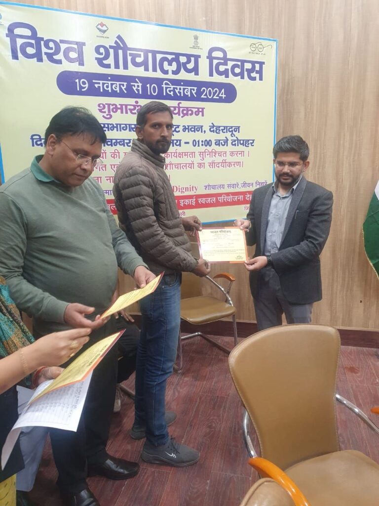 देहरादून दिनांक 19 नवंबर 2024, विश्व शौचालय दिवस 19 नवम्बर 2024 विश्व शौचालय दिवस से 10 दिसम्बर 2024 ‘विश्व मानवाधिकार दिवस’ तक जनपद स्तर पर की जाने वाली गतिविधियों हेतु मुख्य विकास अधिकारी अभिनव शाह की अध्यक्षता आज ऋषिपर्णा सभागार, कलेक्ट्रेट भवन, देहरादून में विश्व शौचालय दिवस’ का शुभारम्भ किया गया। सर्वप्रथम परियोजना प्रबन्धक स्वजल द्वारा विश्व शौचालय दिवस’ में उपस्थित सभी जिला स्तरीय अधिकारियों, जनप्रतिनिधियों एवं शौचालय निर्माण की स्वीकृति हेतु पात्र लाभार्थियों का स्वागत किया गया एवं विश्व शौचालय दिवस’ की निम्नानुसार जानकारी दी गयी। परियोजना प्रबन्धक स्वजल द्वारा अवगत कराया गया कि यह अभियान 19 नवम्बर 2024 से 10 दिसम्बर 2024 तक चलाया जाना है। जिसमें मुख्य भूमिका जिला पंचायत राज विभाग/शिक्षा विभाग / स्वास्थ्य विभाग / जिला पंचायत/पेयजल विभाग / बाल विकास विभाग / स्वजल विभाग और समस्त खण्ड विकास अधिकारियों की रहेगी। इस अभियान के तहत् निम्नलिखित गतिविधियां संचालित की जानी है।