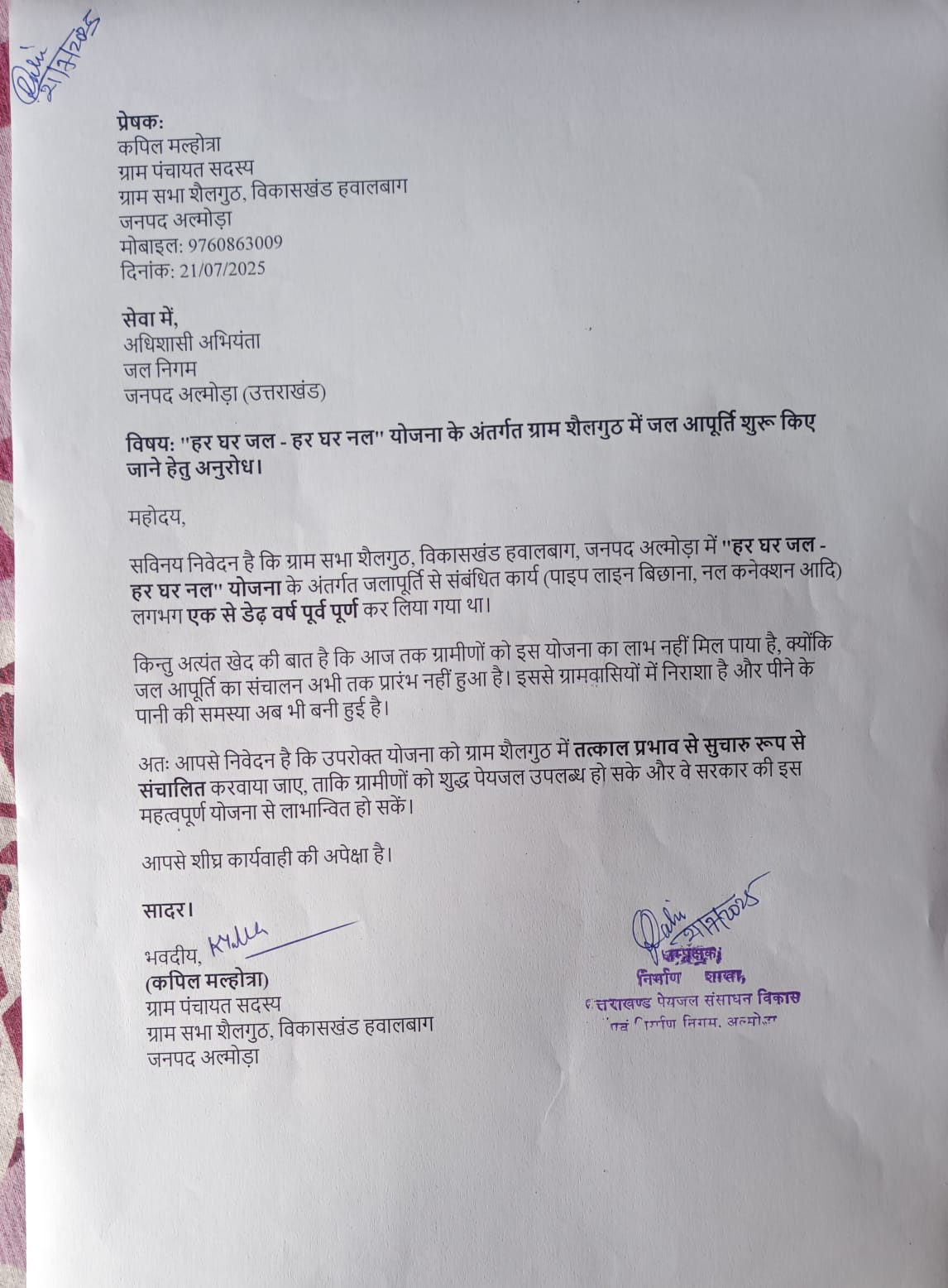 इस गंभीर विषय को लेकर ग्राम पंचायत सदस्य कपिल मल्होत्रा ने अधिशासी अभियंता, जल निगम, अल्मोड़ा को एक औपचारिक पत्र प्रेषित किया है। पत्र में उन्होंने स्पष्ट किया है कि ग्रामीणों को अब तक पानी नहीं मिल रहा है, जबकि योजना का भौतिक कार्य लंबे समय पहले ही पूरा हो चुका है।