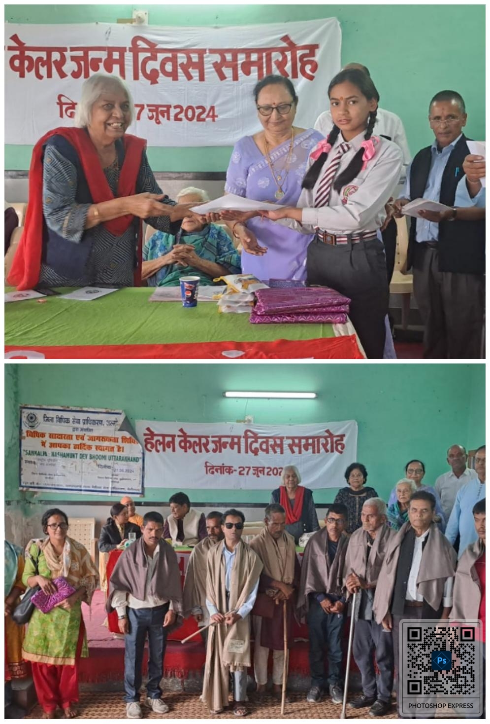सर्वप्रथम मुख्य अतिथि मंगलदीप विद्या मंदिर खत्याड़ी की प्रबंधक मनोरमा जोशी समेत अन्य अतिथियों ने दीप प्रज्वलित कर समारोह का शुभारंभ किया और सभी अतिथियों ने हेलन केलर के चित्र पर पुष्पांजलि अर्पित कर उन्हें श्रद्धांजलि दी। इस मौके पर वक्ताओं ने कहा कि हेलन केलर ने महान कार्य करके पूरे विश्व को नई सीख दे डाली और वह महान प्रेरणास्रोत बनी। वक्ताओं ने समाज के सक्षम लोगों से जरुरतमंद दिव्यांगों की मदद के लिए आगे आने की अपील भी की। इसके अलावा दृष्टिहीन संघ के कार्यक्रमों व प्रयासों को लेकर जागरुकता अभियान चलाये जाने की जरुरत बताई। इस मौके पर बच्चों ने शानदार तरीके से भाषण प्रस्तुत करते हुए हेलन केलर के बारे में विस्तृत जानकारी दी। वहीं कुछ दृष्टिबाधितों ने सुंदर गीत प्रस्तुत किए। हेलन केलर की जयंती के उपलक्ष्य में राष्ट्रीय दृष्टिहीन संघ द्वारा गत दिनों आयोजित बच्चों की भाषण प्रतियोगिता में प्रथम, द्वितीय एवं तृतीय स्थान प्राप्त करने वाले छात्र—छात्राओं को पुरस्कार प्रदान कर सम्मानित किया गया।जूनियर एवं सीनियर वर्ग के प्रतिभागियों को स्व. कर्नल केएस बोरा की स्मृति में नगद धनराशि देकर सम्मानित किया गया। वहीं दिव्यांगजनों को मानस पब्लिक स्कूल अल्मोड़ा की ओर से शाल ओढ़ाकर सम्मानित किया गया।
