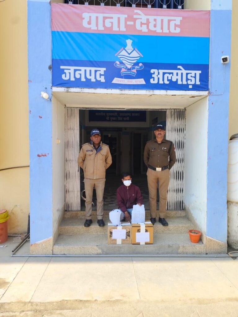 सीओ अल्मोड़ा श्री विमल प्रसाद के पर्यवेक्षण में थानाध्यक्ष देघाट श्री राहुल राठी के नेतृत्व में आज दिनांक 20.12.2023 को थाना देघाट पुलिस द्वारा अवैध मादक पदार्थो की तस्करी/बिक्री की रोकथाम हेतु होटल/ढाबा एवं दुकान चेकिंग अभियान के दौरान स्याल्दे मुख्य तिराहा के पास दुकानदार शंकर सिंह को अपने चाय की दुकान* मे अवैध रुप से शराब बेचने व पिलाने पर दुकान से अंग्रेजी शराब की 01 पेटी, 10 बोतल व एक आधी बोतल बरामद कर