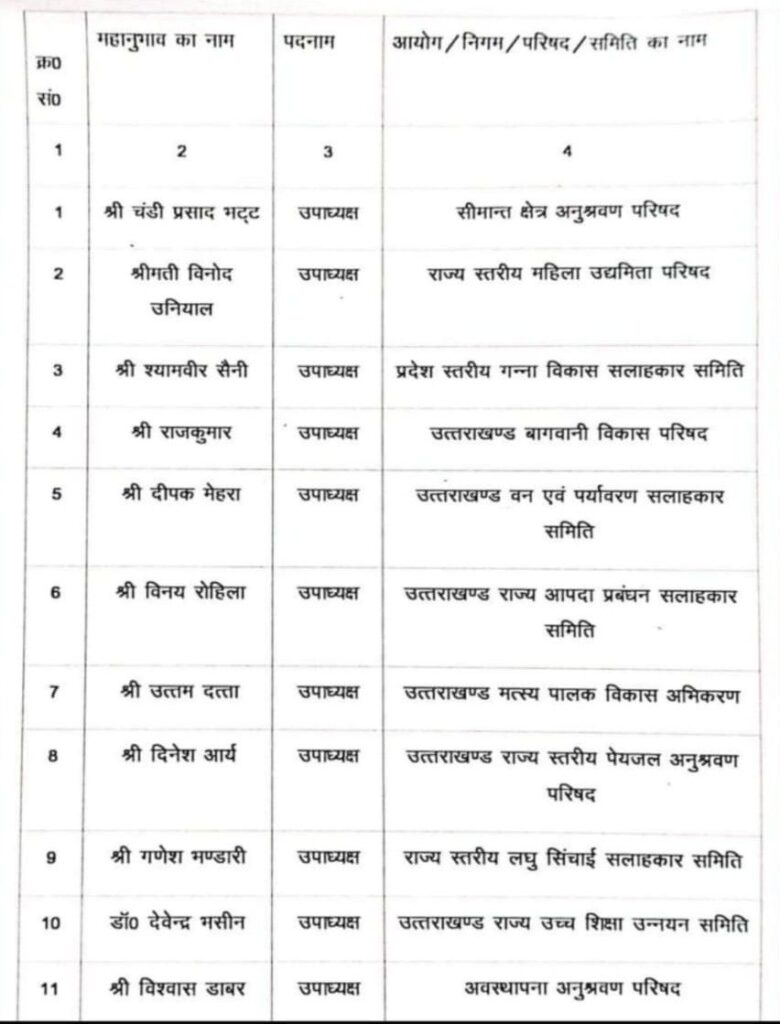 देहरादून: आज देर रात मुख्यमंत्री पुष्कर सिंह धामी ने दूसरे चरण में भाजपा नेताओं को दायित्व सौंप दिए हैं शासन से जारी जारी सूची के अनुसार….चंडी प्रसाद भट्ट उपाध्यक्ष सीमान्त क्षेत्र अनुश्रवण परिषद,विनोद उनियाल उपाध्यक्ष राज्य स्तरीय महिला उद्यमिता परिषद,श्यामवीर सैनी उपाध्यक्ष प्रदेश स्तरीय गन्ना विकास सलाहकार समिति, राजकुमार उपाध्यक्ष उत्तराखण्ड बागवानी विकास परिषद,दीपक मेहरा उपाध्यक्ष उत्तराखण्ड वन एवं पर्यावरण सलाहकार समिति,विनय रोहिला उपाध्यक्ष उत्तराखण्ड राज्य आपदा प्रबंधन सलाहकार समिति,उत्तम दत्ता उपाध्यक्ष उत्तराखण्ड मत्स्य पालक विकास अभिकरण,दिनेश आर्य उपाध्यक्ष उत्तराखण्ड राज्य स्तरीय पेयजल अनुश्रवण परिषद,गणेश भण्डारी उपाध्यक्ष राज्य स्तरीय लघु सिंचाई सलाहकार समिति , डॉ० देवेन्द्र भसीन उपाध्यक्ष उत्तराखण्ड राज्य उच्च शिक्षा उन्नयन समिति और विश्वास डाबर उपाध्यक्ष अवस्थापना अनुश्रवण परिषद के दायित्व सौंपे गए हैं