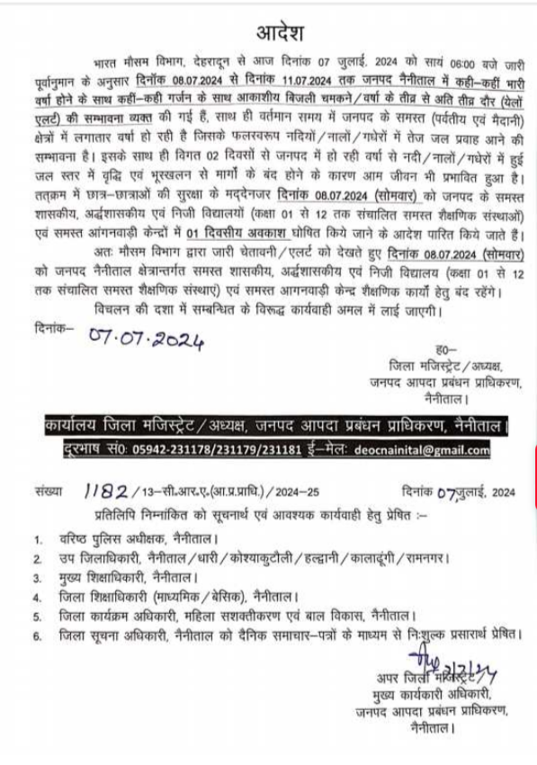 7 जुलाई को जारी मौसम पूर्वानुमान के अनुसार नैनीताल जिले में 11 जुलाई तक कही-कहीं भारी वर्षा होने के साथ कहीं-कही गर्जन के साथ आकाशीय बिजली चमकने / वर्षा के तीव्र से अति तीव्र दौर (येलों एलर्ट) की सम्भावना व्यक्त की गई हैं, साथ ही वर्तमान समय में जनपद के समस्त (पर्वतीय एवं मैदानी) क्षेत्रों में लगातार वर्षा हो रही है जिसके फलस्वरूप नदियों/नालों / गधेरों में तेज जल प्रवाह आने की सम्भावना है। इसके साथ ही विगत 02 दिवसों से जनपद में हो रही वर्षा से नदी/नालों/गधेरों में हुई जल स्तर में वृद्धि एवं भूस्खलन से मार्गों के बंद होने के कारण आम जीवन भी प्रभावित हुआ है। तत्क्रम में छात्र-छात्राओं की सुरक्षा के मद्देनजर 8 जुलाई (सोमवार) को नैनीताल जिले के समस्त शासकीय, अर्द्धशासकीय एवं निजी विद्यालयों (कक्षा 01 से 12 तक संचालित समस्त शैक्षणिक संस्थाओं) एवं समस्त आंगनबाड़ी केन्द्रों में 01 दिवसीय अवकाश घोषित किये जाने के आदेश पारित किये जाते हैं।अतः मौसम विभाग द्वारा जारी चेतावनी / अलर्ट को देखते हुए दिनांक 08.07.2024 (सोमवार) को जनपद नैनीताल क्षेत्रान्तर्गत समस्त शासकीय, अर्द्धशासकीय एवं निजी विद्यालय (कक्षा 01 से 12 तक संचालित समस्त शैक्षणिक संस्थाएं) एवं समस्त आंगनबाड़ी केन्द्र शैक्षणिक कार्यों हेतु बंद रहेंगे। विचलन की दशा में सम्बन्धित के विरूद्ध कार्यवाही अमल में लाई जाएगी।