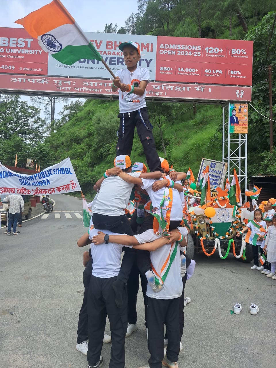 जनतानामा न्यूज़ अल्मोड़ा उत्तराखण्ड आज दिनांक 15 अगस्त 2024 को स्वतंत्रता दिवस के उपलक्ष्य में न्यू इंसप्रेशन पब्लिक स्कूल शैल अल्मोड़ा द्वारा आजादी की 77 वीं वर्षगांठ के शुभ अवसर पर प्रातः 09:00 बजे विद्यालय में ध्वजारोहण किया गया, तत्पश्चात मां भारती की शोभायात्रा विद्यालय परिसर से शैल बाईपास होते हुए एन.टी.डी. फायर स्टेशन से वापस विद्यालय परिसर में सम्पन्न हुई, उक्त शोभायात्रा के साथ ही जगह- जगह पर विद्यालय के नन्हे मुन्ने बच्चों द्वारा रंगारंग कार्यक्रम की प्रस्तुति भी की गई….कार्यक्रम में विद्यालय के बच्चों के साथ-साथ स्थानीय नागरिकों एवं पुलिस के जवानों द्वारा कार्यक्रम को सफल बनाने में सहयोग किया गया ।इस अवसर पर विद्यालय के संस्थापक तारु तिवारी ने बच्चों को देश की आजादी के बारे में बताया एवम् सबको एकजुट होकर अपने देश को उज्वल , दुनिया का बेहतरीन देश बनाने की प्रेरणा दी , विद्यालय के प्रबंधक प्रकाश चंद्र तिवारी ने सभी को महान महापुरुष महात्मा गाधी हमारे देश की आजादी के लिए योगदान के बारे में बताया गया , अहिंसा और सामाजिक एकता पर विश्वास करने की सीख दी , एवम् सभी को स्वतंत्रता दिवस की हार्दिक शुभकामनाएं दी ।