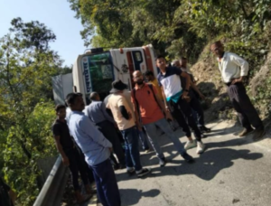 बताया जा रहा है बस के ब्रेक फेल होने के कारण गाड़ी पलटी गई। बस ड्राइवर की सूझबूझ से चालक ने बस को चट्टान की तरफ टक्करा दी ताकि बस खाई की ओर ना गिरे। जिस कारण ड्राइवर को हल्की-फुलकी चोट आई है !