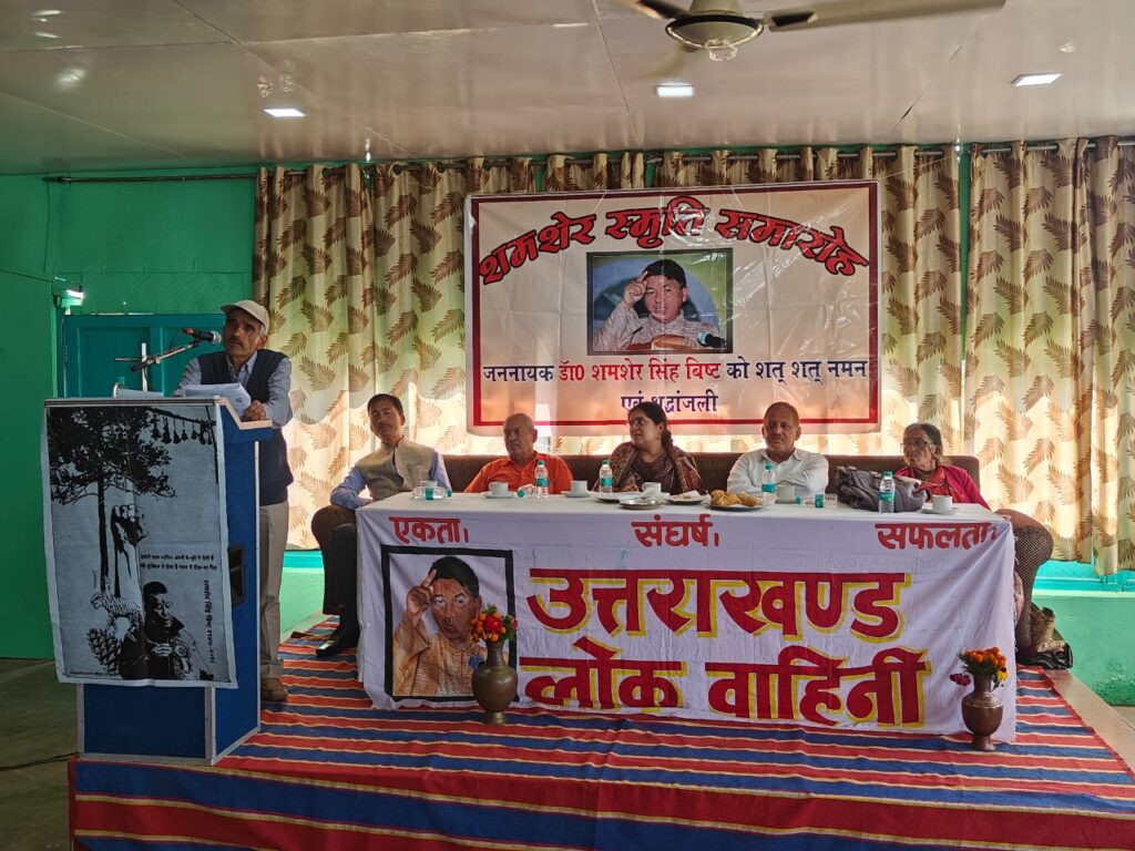 अल्मोड़ा जननायक डा. शमशेर सिंह बिष्ट की पांचवीं पुण्यतिथि पर उनके संघर्ष को याद करते हुवे श्रद्धांजलि दी गई । इस सभा मे बतौर मुख्य अतिथि हिमांचल की मासी पाशर ने कहा कि हिमाचल मे उत्तराखण्ड की तरह पलायन नही है क्योकि हिमाचल प्रदेश ने अपनी जनता को भूमि सुधारों के माध्यम से कृर्षि वागवानी के माध्यम समृद्धि पाई उन्होंने कहा की विकास और आपदाओं में से हम सबको एक चुनना पड़ेगा उन्होंने कहा कि हिमाचल प्रदेश में सब के बागानों तक सड़कों के विस्तार के लिए जो सड़के खोली गई उसके फल स्वरुप वहां बड़े आपदाएं हैं उन्होंने कहा की हिमाचल में बांध के बनने के बाद रोखड़ में तब्दील हो गई नदियों पर बड़े-बड़े होटल व रिसोर्ट में बनाए गए ,किंतु जब हिमांचल में अत्यधिक वर्षा के कारण नदी अपने स्वाभाविक प्रवाह की तरफ बहने लगी जिसके परिणाम स्वरूप हिमाचल में जल प्रलय.आ गया उन्होंने कहा कि उत्तराखंड में जो सड़कों का विस्तार हो रहा है सड़कों के चौड़ाई बढ़ रही है उसे हमें यह समझ लेना चाहिए कि भविष्य में प्राकृतिक आपदाये स्वाभाविक है , इस अवसर पर वन कानूनों पर प्रकाश डालते हुवे विनोद पाण्ड़े ने कहा कि नये बन कानूनों के तहत केन्द्र सरकार ने बनों पर अनियन्त्रित मानवीय गतिविधियों की छूट देने का कानून पास कर दिया है सीमान्त प्रदेशों मे सौ किलोमीटर हवाई पैन्ज मे अब सरकार विकास की छूट देने जा रही है उन्होंने कटाक्ष करते हुवे कहा कि आपदा प्रभावितों के लिये , सरकार के पास जमीने नही है, पर पर्यटन व अन्य गतिविधियों के लिये अनियन्त्रत वन भूमि देने की बात हो रही है कार्यक्रम की अध्यक्षता उत्तराखंड लोक वाहिनी के अध्यक्ष राजीव लोचन साह ने वाहनी के जनसंघर्षों पर प्रकाश डाला उन्होंने कहा कि 1972से विभिन्न आयामों से आगे बढते हुवे उत्तराखण्ड़ राज्य व बड़े बांधों के दुष्प्रभावो पर संघर्ष व जागरण करती रही , इस अवसर पर विनोद पाण्ड़े ने बन कानूनों पर अपनी बात रखते हुवे कहा कि , नये बन कानूनो में अब सरकार को अनियमित छूटे मिल गई है कार्यक्रम में उ लो वा के महासचिव पूरन चन्द्र तिवारी एड जगत रौतेला ,,अजय मित्र बिष्ट , अजय मेहता जंगबहादुर थापा मोहन सिह , शिवदत्त पाण्डे , पहरू के हयात रावत , बार एसोसियेशन के अध्यक्ष महेश परिहार ,उ प पा के अध्यक्ष पी सी तिवारी, सामाजिक कार्यकर्ता आशीष जोशी ,संजय पाण्डे, रंगकर्मी भाष्कर भौर्याल , डा जे सी दुर्गापाल ,आनन्द सिंह बगडवाल ,मोहन काण्डपाल कार्यक्रम का संचालन दयाकृष्ण काण्डपाल ने किया ,।