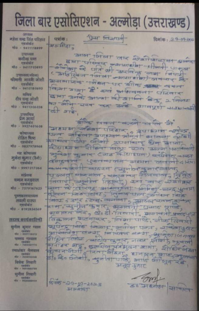 शोक व्यक्त करने वालों में अध्यक्ष महेश परिहार, उपाध्यक्ष कवीन्द्र पन्त, महिला उपाध्यक्ष भावना जोशी, सचिव दीप जोशी, कोषाध्यक्ष रोहित बिष्ट, सहकोषाध्यक्ष मुकेश कुमार, पुस्तकालयाध्यक्ष लवली दास्पा, कार्यकारिणी सदस्य सुनील कुमार, पल्लव गस्याल, विवेक तिवारी, सुनील तिवारी, एवं बार एसोसिएशन के अधिवक्ता सुनीता पांडे, विभा पांडे, नीरू तिवारी, डी. के. जोशी, गिरीश फुलारा, दीवान सिंह बिष्ट , रमेश नेगी, गोधन सिंह बिष्ट, आर. एस. बनौला, रमेश उपाध्याय, मनोज पन्त, भगवती प्रसाद पंत, भगवती प्रसाद पाण्डे, धनंजय साह, भगवत मेर, डी. डी. तिवारी, भूपेन्द्र सिंह मियान, संतोष पन्त, सुनील कुमार, निखिल कुमार, अखिलेश टम्टा, नवल जोशी, मुरली मनोहर भट्ट, इमरोज़ खान, त्रिभुवन शर्मा, शंकर कुमार, रीता मेहरा, कंचना नेगी, भूमिका जिनवाल आदि मौजूद रहे।