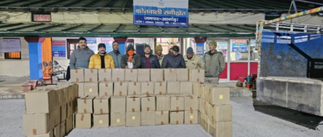 पुलिस के अनुसार प्रभारी निरीक्षक कोतवाली रानीखेत हिमांशु पंत के नेतृत्व में रानीखेत पुलिस व प्रभारी एसओजी सुनील सिंह धानिक व प्रभारी एएनटीएफ सौरभ कुमार भारती द्वारा एसओजी/एएनटीएफ टीम के साथ दिनांक- 26.02.2024 की रात्रि में संयुक्त चेकिंग अभियान के दौरान रानीखेत क्षेत्र में ऐना गांव से करीब 500 मीटर आगे बग्वाली पोखर की तरफ कोरीछीना की ओर से आ रहे *वाहन संख्या- यू0के0-01 सी0ए0-1427 पिकअप को रुकने का ईशारा किया तो वाहन चालक अचानक वाहन को रोककर वापस मोड़ने का प्रयास करने लगा जिसे पुलिस टीम द्वारा त्वरित कार्यवाही करते हुए मौके पर ही रोक लिया गया। वाहन में वाहन चालक मौजूद था, जिसने पूछताछ में वाहन में अवैध शराब होने की बात पुलिस टीम को बताई, जिस पर वाहन पिकअप की तलाशी लेने पर कुल 120 पेटियों में 5,760 पव्वे अवैध देशी शराब गुलाब मार्का बरामद हुई।