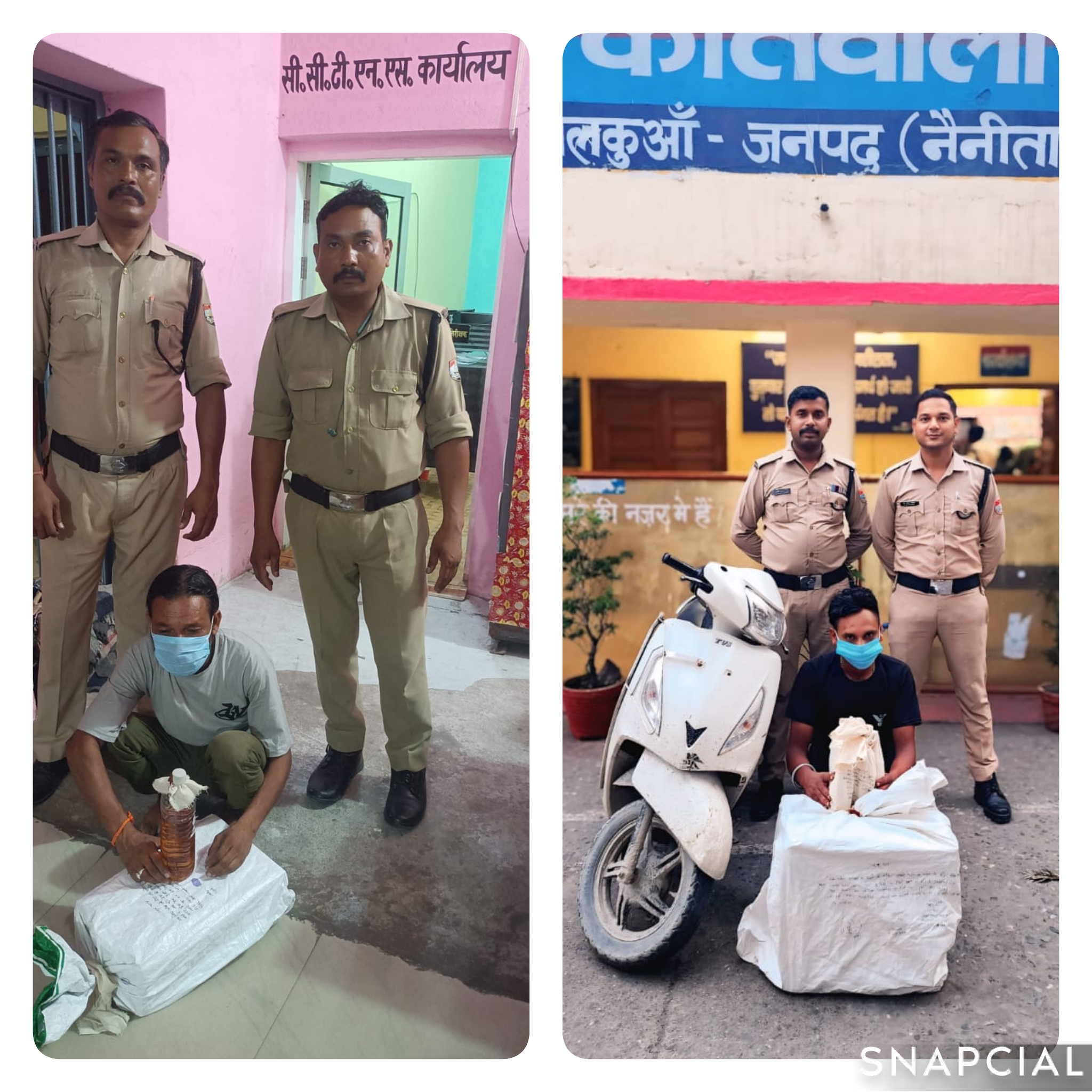इसी क्रम में प्रकाश चंद्र एसपी सिटी हल्द्वानी के दिशा निर्देशन, दीपशिखा अग्रवाल क्षेत्राधिकारी लालकुआं के पर्यवेक्षण में दिनेश फर्त्याल प्रभारी निरीक्षक लालकुआं के कुशल नेतृत्व में लालकुआं पुलिस द्वारा दौराने गश्त अभियुक्त बिट्टू मौर्या पुत्र रामचन्द्र मौर्या निवासी नियर सरकारी अस्पताल मोटाहल्दु लालकुआँ नैनीताल को गोला गेट बेरीपड़ाव मन्नू की झोपड़ी के पास से एक गत्ते की में 52 टेट्रा पैक देशी शराब के गिरफ्तार किया दौराने गिरफ्तारी अभियुक्त बिट्टू मौर्या द्वारा उक्त शराब मनोज बिष्ट उर्फ मन्नू डॉन निवासी पाडलीपुर मोटाहल्दु लालकुआँ द्वारा उसे लालच देकर जबरदस्ती बिकवाना बताया गया जिसके क्रम में अभियुक्त मनोज बिष्ट उर्फ मन्नू डांन के विरूद्ध धारा-60/69(बी) आब0 अधि0 के अन्तर्गत कार्यवाही की गयी तथा उ0नि0 सोमेन्द्र सिंह प्रभारी चौकी बिन्दुखत्ता द्वारा मय हमराही पुलिस बल के अभियुक्त सूरज सिंह पुत्र दिलीप सिंह निवासी वार्ड न0 01 जगतपुरा रूद्रपुर उ0सि0नगर हाल निवासी लालपुर किच्छा उ0सि0नगर को शान्तिपुरी को जाने वाले रास्ते पर डामर प्लान्ट के पास बिन्दुखत्ता लालकुआँ से वाहन संख्या-UK06BA-1298 (स्कूटी ) में 02 पेटियो में अलग-अलग कुल 20 अद्धे व 42 पव्वे IMPERIAL BLUE अंग्रेजी शराब परिवहन करते हुये गिरफ्तार कर अभियोग पंजीकृत किया गया।
