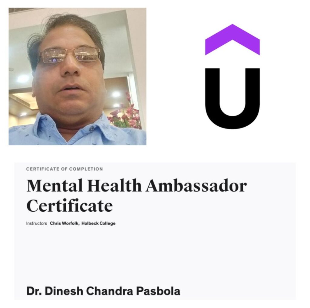 देहरादून: 19-09-2023, मंगलवार। UDEMI, गुड़गांव, हरियाणा द्वारा संचालित “मानसिक स्वास्थ्य राजदूत ” – “Mental Health Ambassador” Certification का 02 दिवसीय प्रशिक्षण प्राप्त कर डॉ० डी० सी० पसबोला सर्टीफाइड “”मानसिक स्वास्थ्य राजदूत ” – “Mental Health Ambassador” बन गये हैं। जो कि UDEMI तथा Holbeck College द्वारा निर्मित एवं मान्यताप्राप्त कोर्स है। जिसमें Dr. Chris Worfolk द्वारा प्रशिक्षण प्रदान‌ किया जाता है।