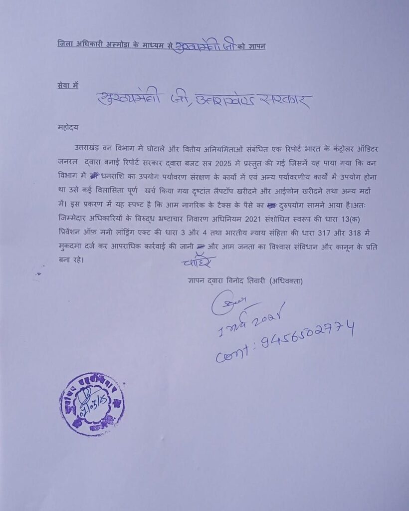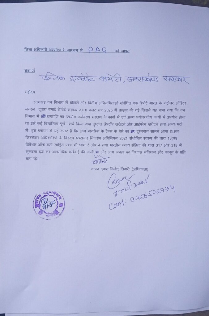 बजट सत्र 2025 में उत्तराखंड की सरकार द्वारा भारत के कंट्रोलर ऑडिटर जनरल( कैग) की एक रिपोर्ट को सरकार द्वारा विधानसभा में प्रस्तुत किया गया जिसमें वन विभाग में और CAMPA योजना में कई सारी गंभीर वित्तीय अनियमितताओं और धन के दुरुपयोग का प्रकरण सामने आया इस विषय पर राष्ट्र नीति संगठन के अध्यक्ष एडवोकेट विनोद तिवारी ने आज जिला अधिकारी अल्मोड़ा के माध्यम से एक ज्ञापन मुख्यमंत्री उत्तराखंड सरकार , प्रधानमंत्री भारत सरकार और पब्लिक अकाउंट कमिटी उत्तराखंड को भेजा और जिम्मेदार अधिकारियों  के विरुद्ध भ्रष्टाचार निवारण संशोधन अधिनियम 2021 की धारा 13 क तथा प्रीवेंशन आफ मनी लांड्रिंग एक्ट की धारा 3 तथा 4 और भारतीय न्याय संहिता की धारा 317और 318 में मुकदमा दर्ज कर उन्हें कड़ी कार्रवाई करने का आवाहन किया है।