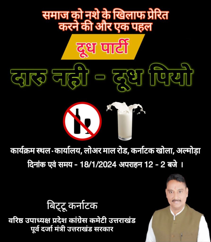 18 जनवरी 2024 को अपराह्न 12:00 बजे से दिन में 2:00 बजे तक दूध (जलेबी) पार्टी का आयोजन करने जा रहे हैं। जिसमें उन्होंने सभी लोगों को आमंत्रित किया है।