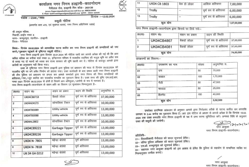 हल्द्वानी नगर निगम ने बनभूलपुरा के मुख्य आरोपी के नाम जारी किया 2.44 करोड़ का वसूली नोटिस
