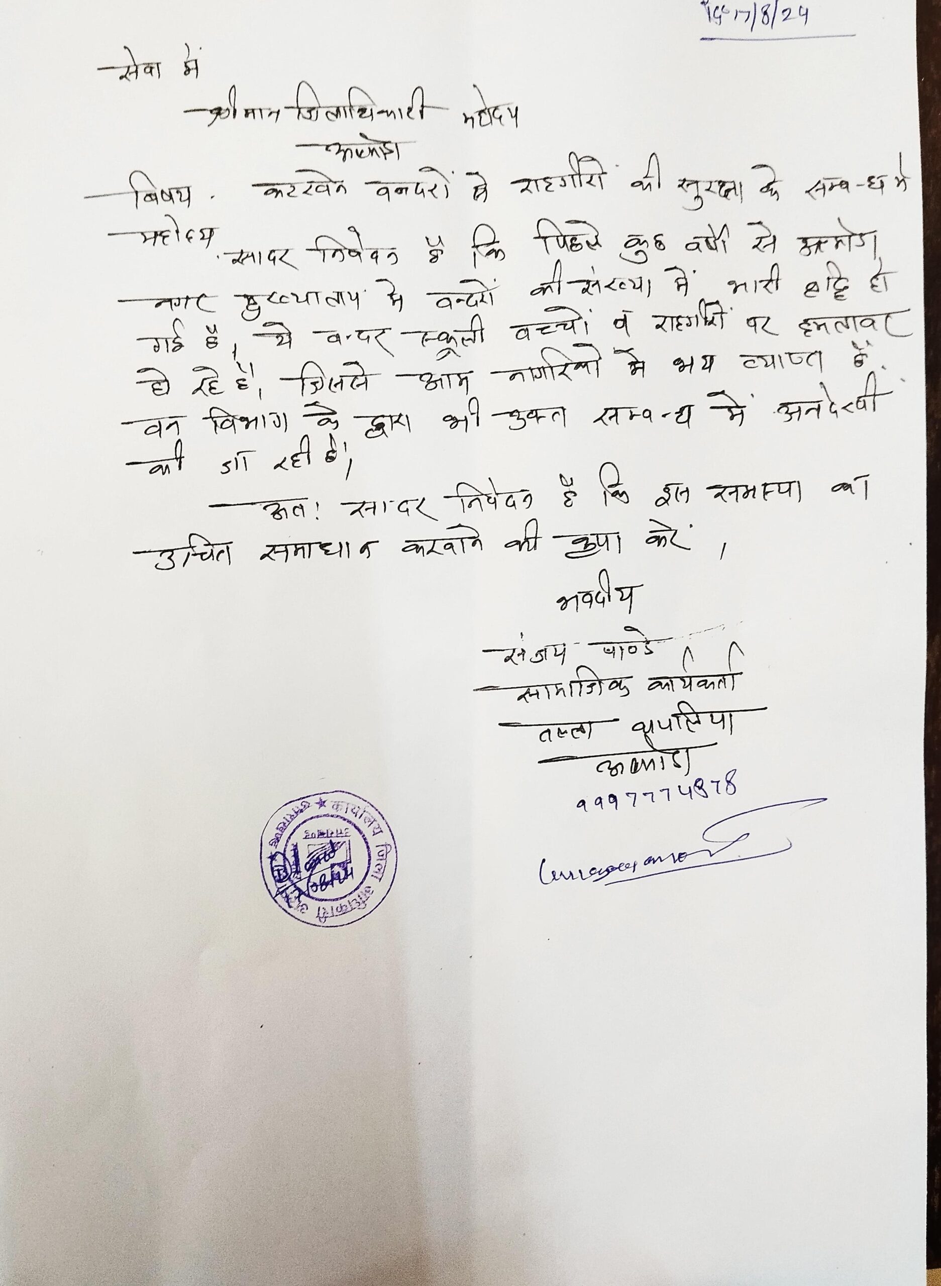 ज्ञापन में मांग की गई है कि बाहरी जनपदों से सेंचुरी के नाम पर लाए जा रहे बंदरों की रोकथाम के लिए क्वारब पुल पर कड़ी चेकिंग की जाए। साथ ही, इस बढ़ते खतरे को देखते हुए वन विभाग को त्वरित कार्रवाई करने की आवश्यकता है, ताकि बच्चों और बुजुर्गों का सुरक्षित आवागमन सुनिश्चित हो सके और लोग भयमुक्त हो सकें।