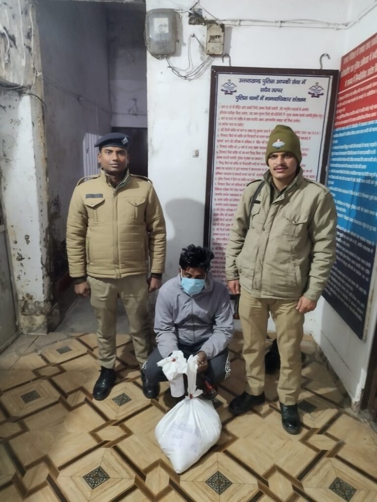 थानाध्यक्ष खनस्यू विजयपाल सिंह के नेतृत्व में पुलिस टीम द्वारा सिमलिया बैण्ड के पास दौरान चैकिंग वाहन संख्या- UK 04- TA- 7122 को चैक किये जाने पर जगदीश चन्द्र रुवाली पुत्र श्री मुरलीधर रुवाली, निवासी ग्राम- मटेला, पो०-पतलोट , थाना-खनस्यू, जनपद-नैनीताल, उम्र-27वर्ष,