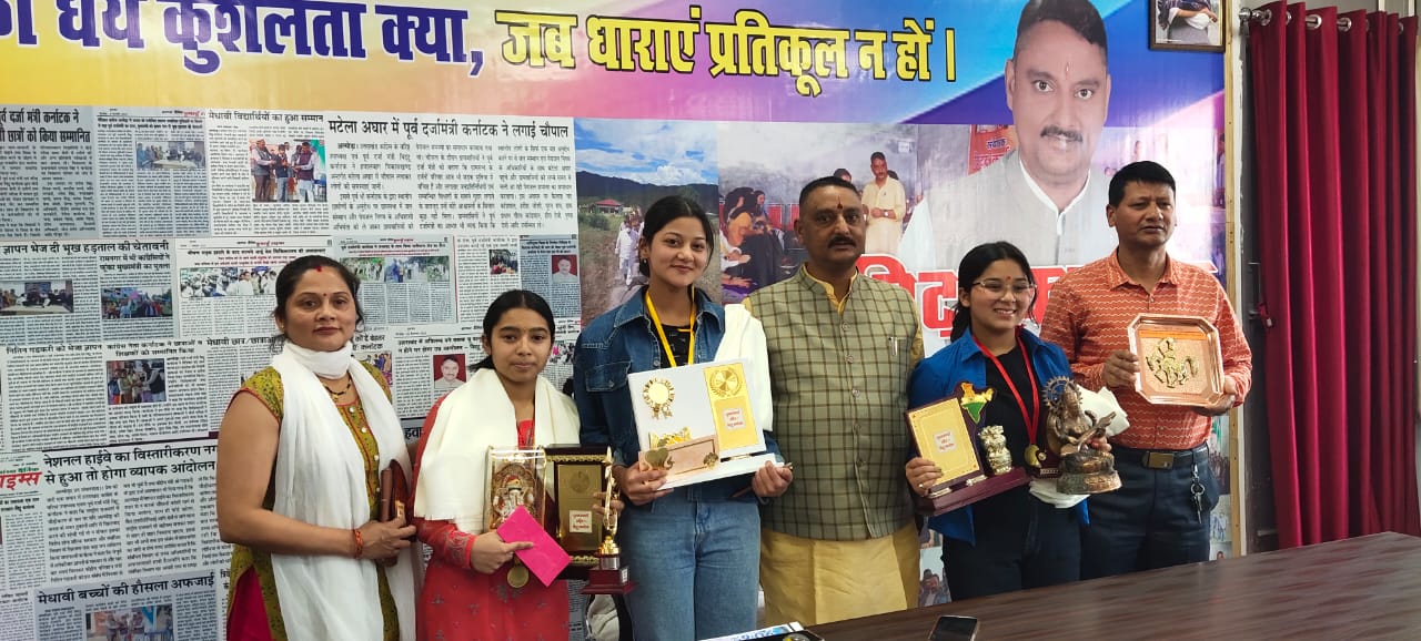 अल्मोड़ा-आज पूर्व दर्जा मंत्री बिट्टू कर्नाटक ने आर्य कन्या इंटर कालेज अल्मोड़ा में इन्टरमीडिएट की परीक्षा में विद्यालय में सर्वोच्च स्थान प्राप्त करने वाली कॉमर्स की होनहार छात्रा राशि भाकुनी को अपने कार्यालय में सम्मानित किया।  कॉमर्स की छात्रा राशि भाकुनी ने इन्टरमीडिएट की परीक्षा में 90.6 प्रतिशत अंकों के साथ विद्यालय में सर्वोच्च स्थान प्राप्त किया है।इसके साथ ही इंटरमीडिएट में डौली रौतेला(84.2%) एवं निकिता खेतवाल (83.6%)को विधालय में द्वितीय एवं तृतीय स्थान प्राप्त करने में सम्मानित किया। साथ ही हाई स्कूल की परीक्षा में प्रथम,द्वितीय एवं तृतीय स्थान प्राप्त  प्राची जीना ने 81.8 प्रतिशत,प्रियंका गढ़िया ने 78.6 प्रतिशत एवं वर्तिका पांडे ने 74 प्रतिशत अंकों से उत्तीर्ण छात्राओं को भी पूर्व दर्जा मंत्री कर्नाटक ने ट्रॉफी, मेडल, नकद पुरस्कार और अंगवस्त्र भेंट कर सम्मानित किया।।