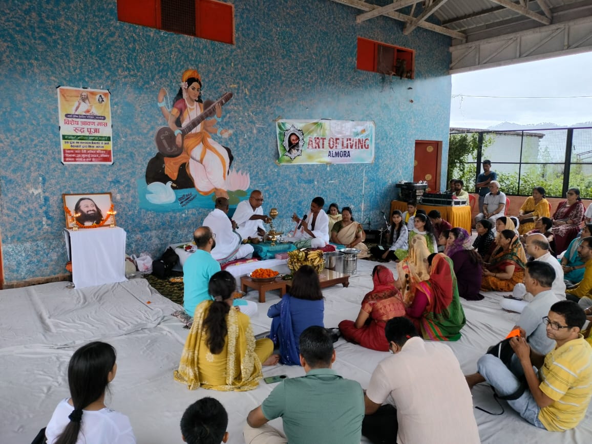 अल्मोड़ा । रविवार को आज आर्ट ऑफ लिविंग, अल्मोड़ा द्वारा स्थानीय नंदा देवी मंदिर परिसर अल्मोड़ा में श्रावन मास विशेष सामुदायिक रूद्र पूजा एवं दिव्य भजन संध्या का आयोजन किया गया। इस पूजा में बेंगलुरु से आए स्वामी मुक्तानंद महाराज एवं सहयोगी जनो द्वारा आज स्थानीय नंदा देवी परिसर मंदिर में श्रावण मास के पवित्र मौके पर रुद्र पूजा अभिषेक कर रवि शंकर महाराज के दर्शन ज्ञान का प्रवचन दिया गया। मुक्तानंद के सानिध्य में गान ध्यान एवं ज्ञान और दर्शन का लाभ भक्त जनों ने प्राप्त किया।