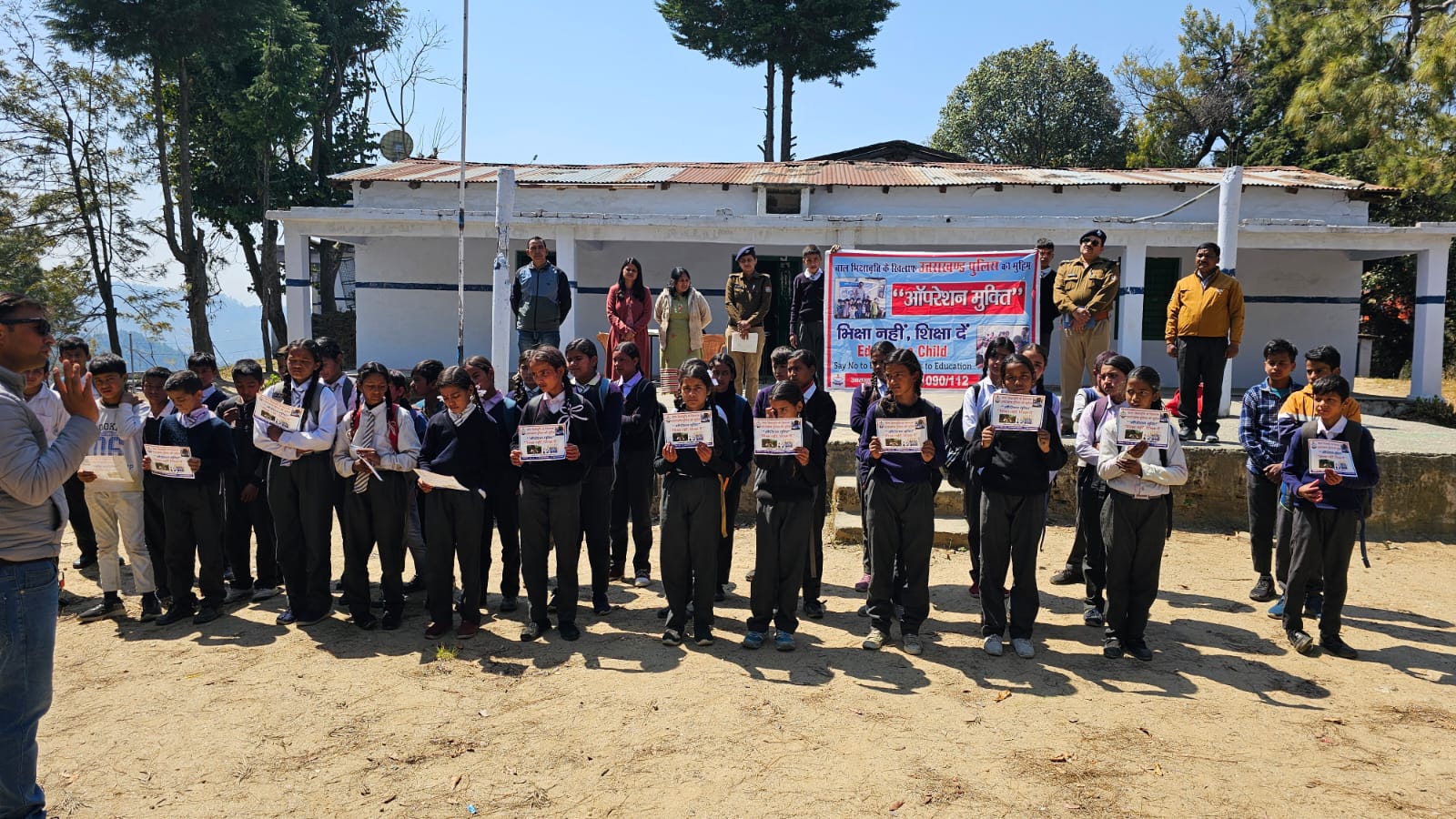 उत्तराखण्ड पुलिस द्वारा चलाये जा रहे ऑपरेशन मुक्ति अभियान के क्रम में एसएसपी अल्मोड़ा देवेन्द्र पींचा के निर्देशन पर श्री विमल प्रसाद सीओ अल्मोड़ा के पर्यवेक्षण में आज दिनांक 20/03/2024 को आँपरेशन मुक्ति टीम द्वारा डीनापानी क्षेत्र में जीआईसी के छात्र-छात्राओं व स्कूल स्टॉफ को पम्पलेट बांटकर/चस्पा कर व बैनर के माध्यम से छोटे बच्चों से बाल श्रम न करवाने व भिक्षा न देने के लिए जागरुक करते हुए अपील कर कहा कि अगर आपको कही भी इस प्रकार से छोटे बच्चें भिक्षा मांगते हुए या बाल श्रम करते हुए दिखे तो इसकी सूचना तत्काल पुलिस को दें, जिसमें पुलिस द्वारा आवश्यक कार्यवाही कर बच्चों का स्कूल में दाखिला कराया जायेगा।