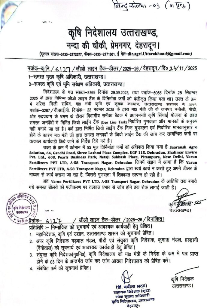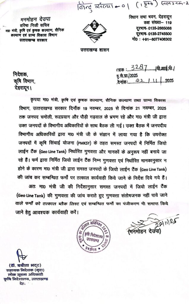 कृषि मंत्री कार्यालय द्वारा पत्रांक 3287, दिनांक 21 नवम्बर 2025 को जारी आदेश में साफ कहा गया था कि प्रदेश के सभी जिलों में निर्मित जियो लाइन टैंकों की गुणवत्ता की जांच कर दोषी फर्मों पर तत्काल कार्रवाई की जाए। यह निर्देश तब जारी हुआ था जब मंत्री के निरीक्षण के दौरान चमोली, रुद्रप्रयाग और पौड़ी जिलों में टैंकों की गुणवत्ता पर सवाल उठे थे।