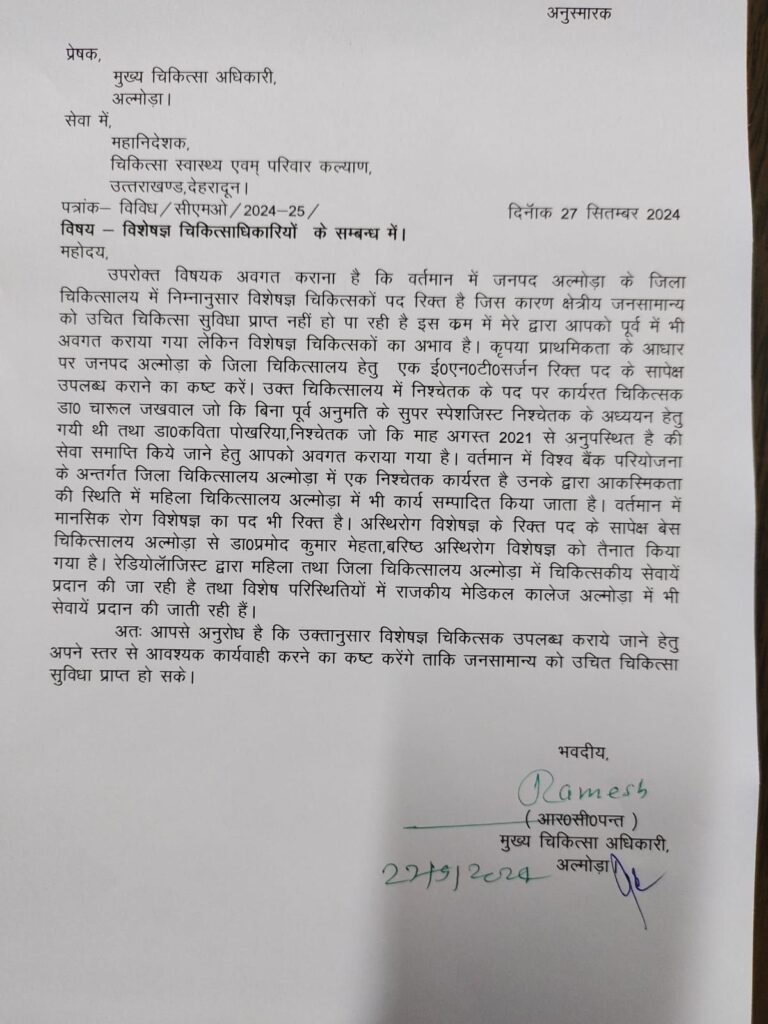 उन्होंने सभी संबंधित अधिकारियों से जनहित में त्वरित कार्रवाई करने की अपील की, ताकि अल्मोड़ा के नागरिकों को बेहतर और सस्ती स्वास्थ्य सेवाएं उपलब्ध हो सकें।