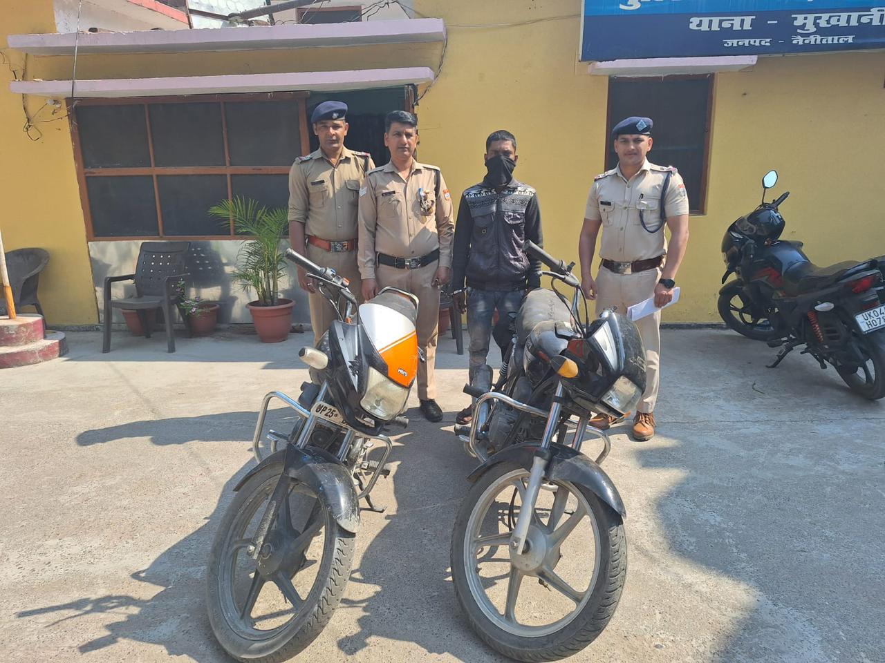 अनुपालन में  प्रकाश चंद्र पुलिस अधीक्षक नगर हल्द्वानी एवं क्षेत्राधिकारी हल्द्वानी नितिन लोहनी के पर्यवेक्षण में थानाध्यक्ष मुखानी  पंकज जोशी के नेतृत्व में  पुलिस टीम द्वारा चोरी में संलिप्त योगेश कुमार मौर्य उम्र- 22 वर्ष पुत्र रामकुमार मौर्य निवासी बसंत फुलेरा के खेत में जीआईसी कटघरिया के पीछे बजुनिया हल्दु थाना मुखानी जनपद नैनीताल उम्र 22 वर्ष को हैडाखान मंदिर से  विठोरिया को जाने वाले रास्ते से मय वाहन मोटरसाइकिल स्प्लेंडर प्लस यूके 04S 3749 के साथ गिरफ्तार किया गया।