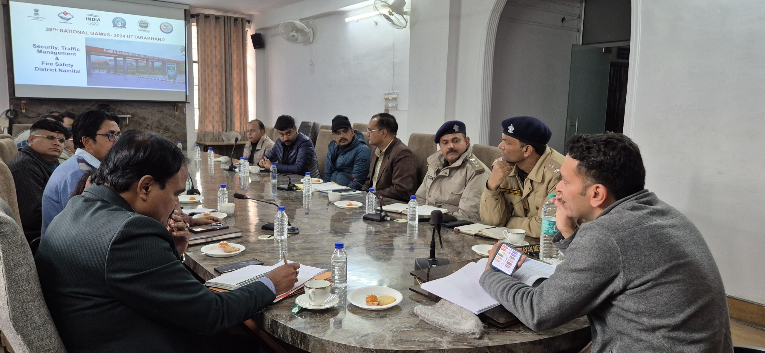 आज प्रहलाद नारायण मीणा, एसएसपी नैनीताल द्वारा दिनांक 28.01.2025 से प्रारंभ होने वाले 38वें नेशनल गेम्स 2025 के दृष्टिगत जिले के अलग–अलग स्थानों में आयोजित होने वाले खेलों के सकुशल आयोजन हेतु प्रभावी सुरक्षा और यातायात व्यवस्था के लिए आवश्यक मुद्दों पर चर्चा हेतु हल्द्वानी स्थित पुलिस बहुदेशीय भवन सभागार में नेशनल गेम्स के मैनेजमेंट हेतु लगी कार्यदाई संस्थाओं के प्राधिकारियों के साथ बैठक की गई। सभी के साथ इन मुद्दों पर चर्चा की गई:–