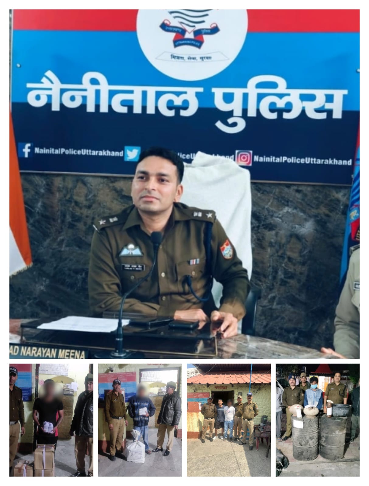 आगामी लोक सभा चुनाव-2024 को निष्पक्ष एवं शांतिपूर्ण सम्पन्न कराने हेतु प्रहलाद नारायण मीणा वरिष्ठ पुलिस अधीक्षक जनपद नैनीताल द्वारा सभी थाना प्रभारी/चौकी/एसओजी प्रभारियों को अपने-अपने क्षेत्रों में लगातार *सघन चैकिंग किये जाने तथा मादक पदार्थों की तस्करी करने वालों के विरुद्ध कड़ी कार्यवाही* करने के निर्देश पर नैनीताल पुलिस द्वारा अलग-अलग 04 मामलों में अंग्रेजी, देशी, कच्ची शराब एवं बनाने के उपकरण एवं स्मैक बरामद कर 05 व्यक्तियों को गिरफ्तार किया है।