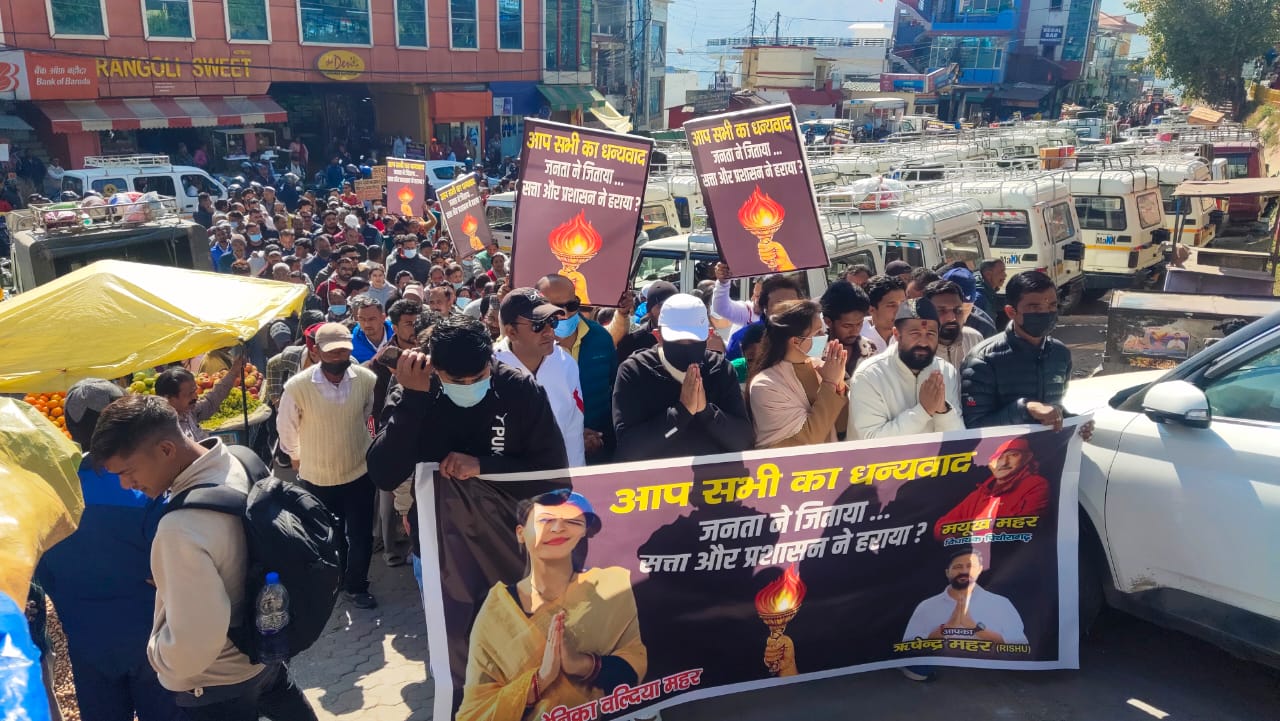 इस मामले को लेकर सोमवार को मोनिका महर ने पिथौरागढ़ विधायक मयूख महर तथा युवा नेता ऋषेन्द्र महर की संयुक्त अगुआई में समर्थकों के भारी हुजूम के साथ नगर में मौन जुलूस निकाला। इस दौरान उनके समर्थक हाथों में एक ही नारा लिखी तख्तियां व बैनर लेकर चल रहे थे, जिनमें लिखा था ‘आप सभी का धन्यवाद, जनता ने जिताया… सत्ता और प्रशासन हराया ? ‘। नगर के विभिन्न मार्गों से गुजरे मौन जुलूस में बड़ी संख्या में महिलाएं और युवा शामिल थे। मौन जुलूस के बाद मोनिका और उनके पति युवा नेता ऋषेन्द्र ने कहा कि मतगणना में उनके साथ हुए अन्याय के खिलाफ जनपद में प्रसिद्ध न्याय की देवी कोटगाड़ी के मंदिर में अर्जी लगाने के साथ ही कोर्ट का भी दरवाजा खटखटाएंगे।