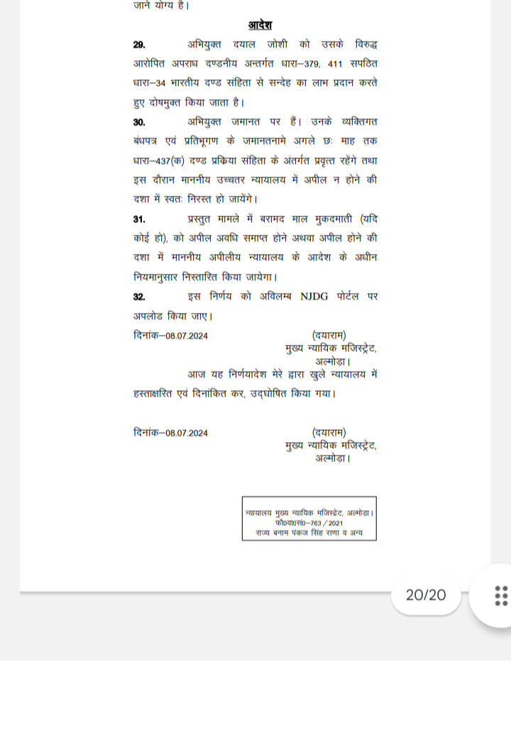 कि न्यायाधीश द्वारा पत्रावली में उपलब्ध साक्ष्य को देखते हुए अभियुक्त दयाल जोशी को दोषमुक्त कर दिया।मामले में अभियुक्त दयाल जोशी की तरफ से वरिष्ठ अधिवक्ता भगवती प्रसाद पंत एवम् अधिवक्ता आर. पी. भट्ट द्वारा पैरवी की गई।
