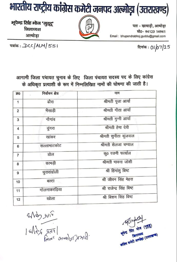 अल्मोड़ा में त्रिस्तरीय पंचायत चुनाव के लिए तैयारियां शुरू हो गई है। इसी बीच आगामी जिला पंचायत चुनाव के लिए जिला पंचायत सदस्य पद के लिए कांग्रेस के अधिकृत प्रत्याशी के रूप में निम्नलिखित नामों की घोषणा की गई है।